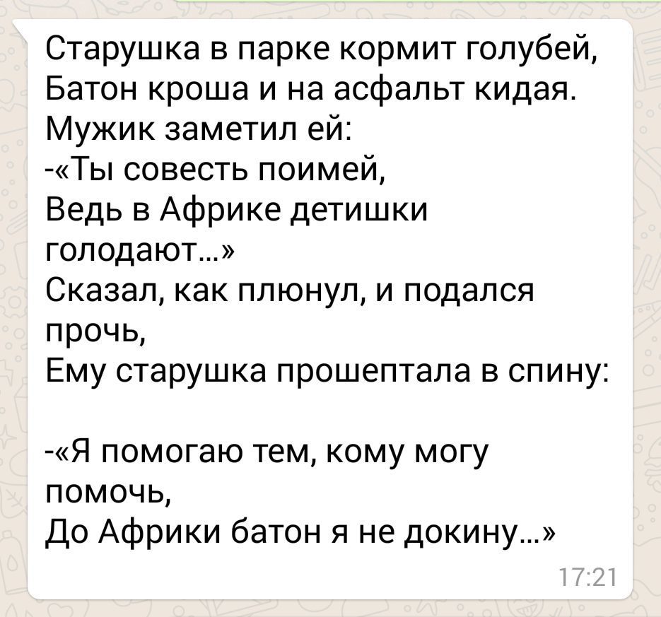 Старушка в парке кормит голубей, Батон кроша и на асфальт кидая. Мужик заметил ей: "Ты совесть поимей, Ведь в Африке детишки голодают..." Сказал, как плюнул, И подался прочь... Ему старушка прошептала в спину: "Я помогаю тем, кому могу помочь. До Африки батон я не докину..."