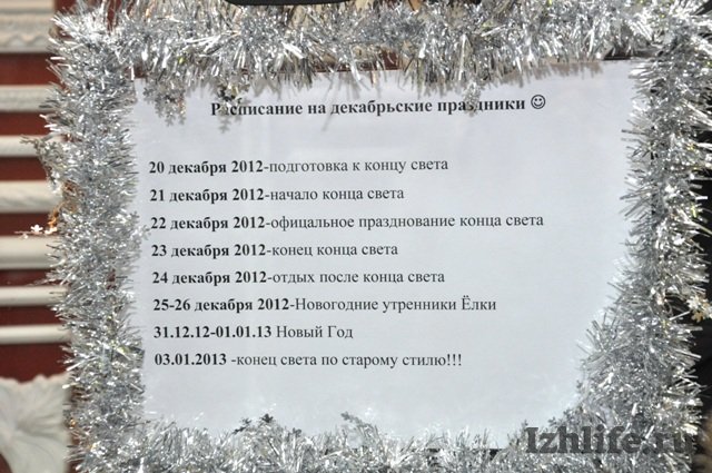 Люда-мила писал(а): :21 дек 2012, 00:19 №5098 По телевизору говорят полстраны не спит- ждет конец света сын седня попросил включить ему фильм День когда земля остановилась. - про конец света. в саду воспиток пугал, все ждет - охота ему посмотреть как все рушиться будет. мы уже конец света седня пережили - у нас пробки вылетали. а ваще план такой: