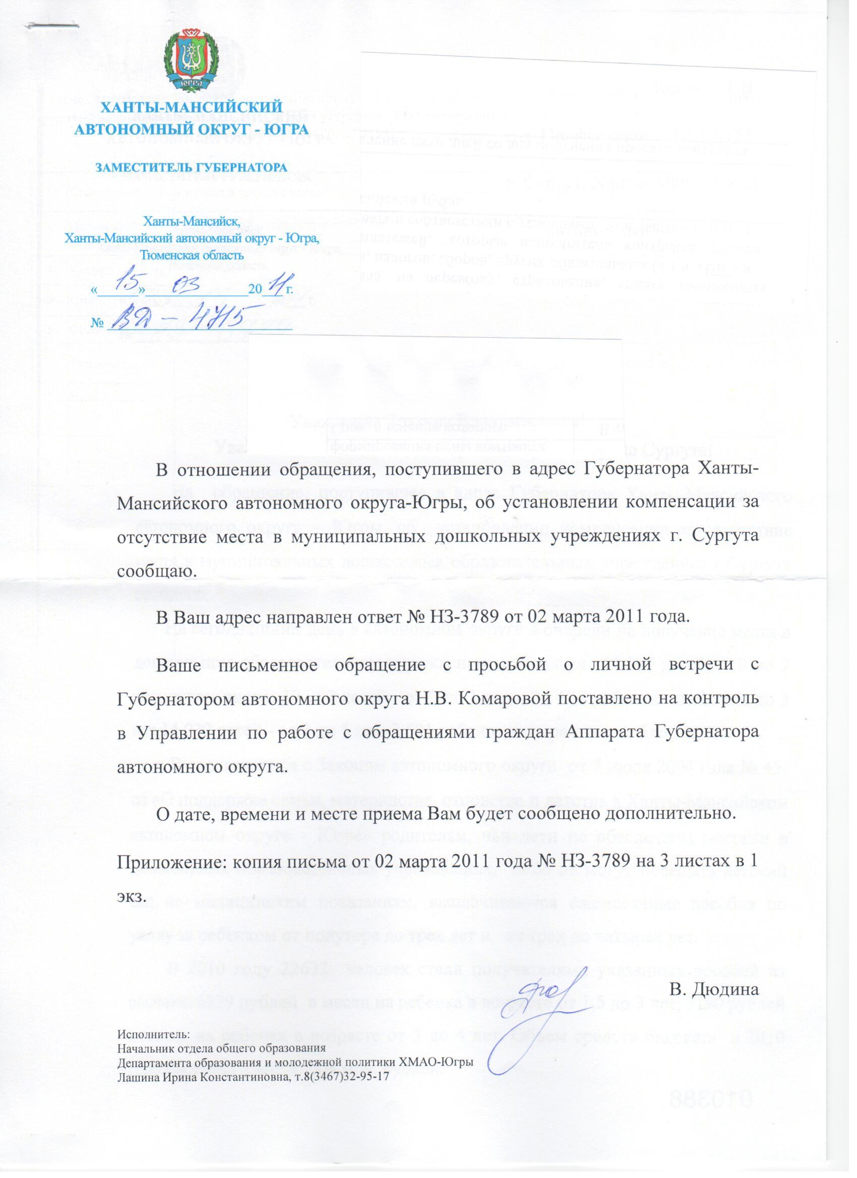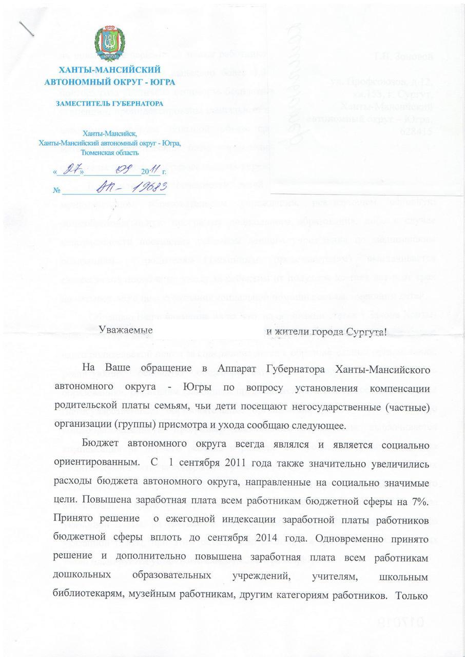 Решение правительства округа - Отказать в предоставлении компенсации! Мы благодарим всех подписавшихся и сборщиков подписей! собранно 1774 подписи Письмо направленно 2.02.2011 контактный e-mail: SDDO-86@mail.ru Первый ответ Цитата: О дальнейших решениях Вам будет сообщено дополнительно. 10 февраля нами было направленно заявление в адрес Губернатора с просьбой о личной встрече на территории города Сургута. Будем надеяться - нам не откажут. Это только наши предположения, как будет в реальности не известно. ЖДЕМ ВТОРОГО ПИСЬМА Второй ответ Ответ на просьбу о личной встрече с Губернатором. Цитата: В отношении обращения, поступившего в адрес Губернатора Ханты-Мансийского автономного округа-Югры, об установлении компенсации за отсутствие места в муниципальных дошкольных учреждениях г. Сургута сообщаю. В Ваш адрес направлен ответ № НЗ-3789 от 02 марта 2011 года. Ваше письменное обращение с просьбой о личной встречи с Губернатором автономного округа Н.В. Комаровой поставлено на контроль в Управлении по работе с обращениями граждан Аппарата Губернатора автономного округа. О дате, времени и месте приема Вам будет сообщено дополнительно. Финал нашей истории! Цитата: В настоящее время ваше предложение об установлении ещё одного вида компенсации родительской платы за содержания детей в организациях (группах) присмотра и ухода не может быть реализовано в данном виде.