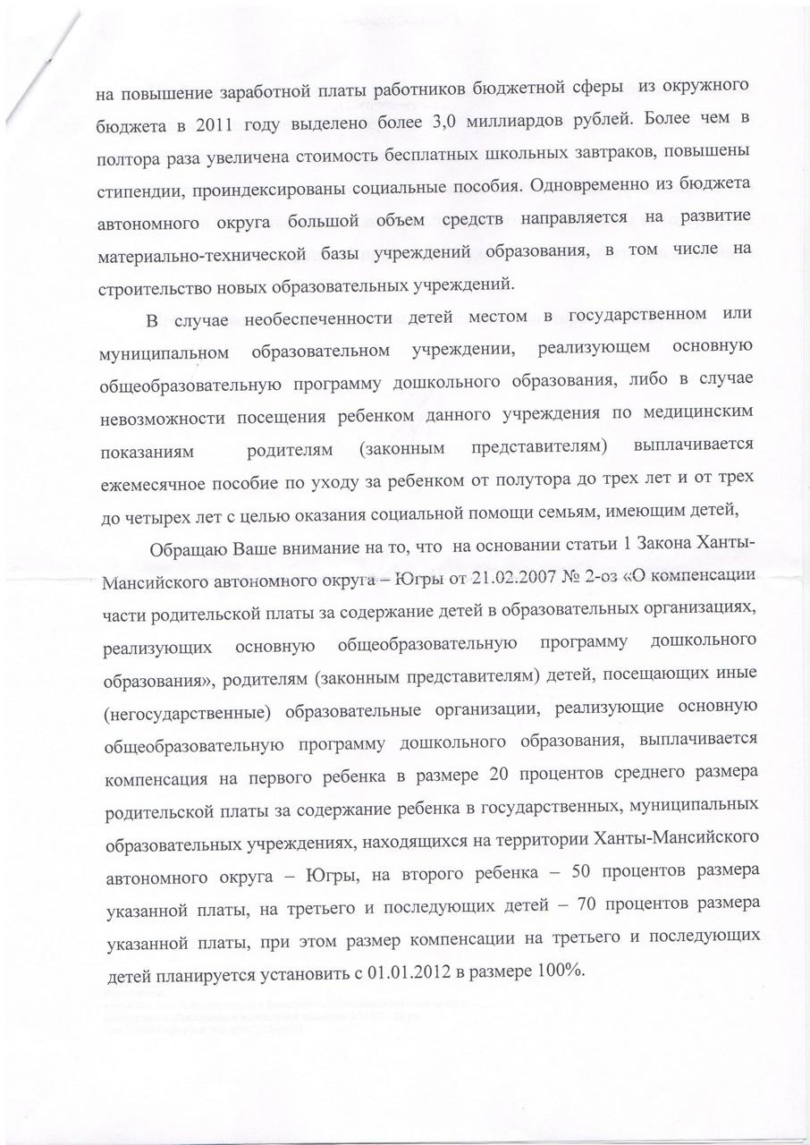 жителей города Сургута Ханты-Мансийского автономного округа по вопросу компенсации за отсутствие места в муниципальном дошкольном учреждении. Просим ознакомиться и прокомментировать.