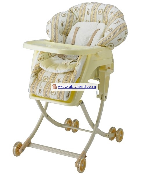 У нас он на 4-х колесиках со стопорами. Очень компактный в сложенном виде, высота стула регулируется в 6 положениях, спинка в трёх. Столик имеет ограничитель, что бы деть не выпал, так же есть ремни безопасности. Кода малыш подрастет, можно столик убрать и придвинуть стул к общему столу. Сейчас мы его используем как шезлонг, а со старшим сыном наш стульчик был спасением, одно время сын стал засыпать днем только с укачиванием, и мы спасались стулом, опускали спинку, поднимали подножку и получалось удобное место для сна, а т.к стул на колесиках мы его в нем укачивали. |