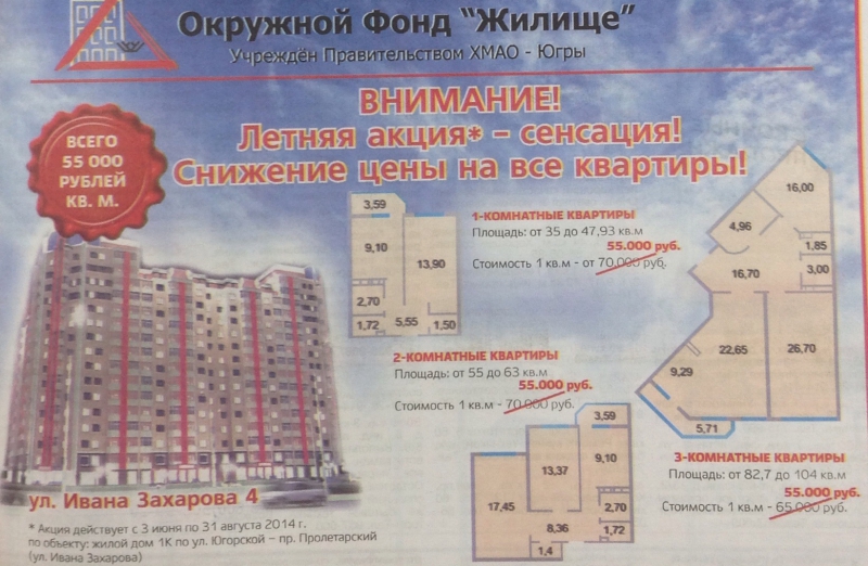 ARTSurgut писал(а): : 17.07.2014 14:27 Сегодня увидел в объявлении, что в нашем доме и в соседнем квартиры по 55 тыс. за кв. м. Расстроился (((( А где вы смотрели объявление, на сайте Жилище цена 70000 за кв м |