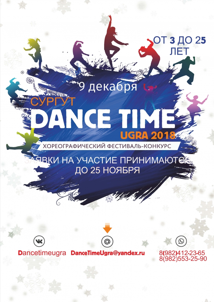 «DANCE TIME UGRA 2018» Место проведения: г.Сургут, Театр СурГУ (проспект Ленина д.1) Дата и время проведения: 9 декабря 2018 года Заявки принимаются до 25 ноября 2018 года Будем рады Вашему участию в "DanceTame Ugra", С уважением Диордица Наталия https://vk.com/dancetimeugra 8 982 41 22 365 8 982 55 32 590