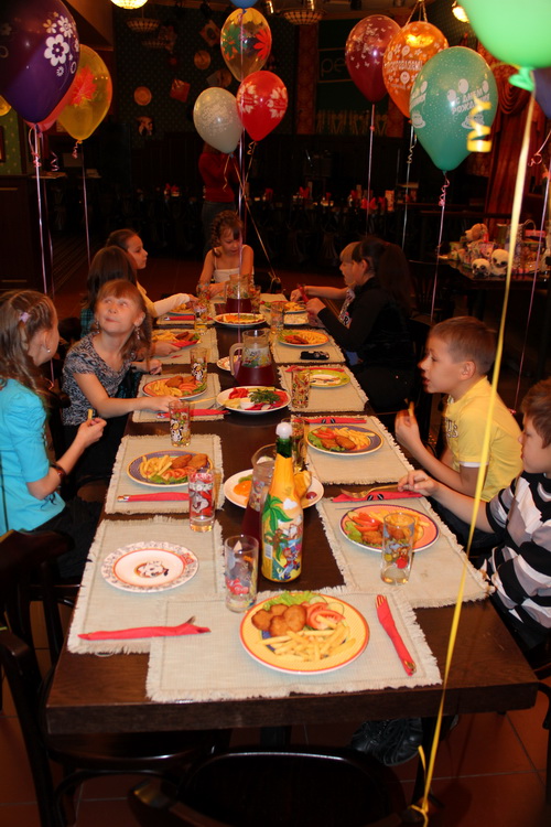 - меню по цене 500 рублей на одного ребенка включает :салат оливье , картошку фри с двумя котлетками, тарелки с овощной и фруктовой нарезкой , 3 пиццы, морс . Овощную нарезку можно не заказывать ( никто не съел) , а фруктовую мы ещё дозаказывали 2 тарелки . Морс дети не пили , налегали на детское шампанское ( разрешают приносить)и ещё мы заказывали молочные коктейли 1 стакан 300 мл по 140 рублей . После всей этой еды для торта места н осталось - давали в нагрузку домой ![]() ![]() -аниматор (работала 2 часа - оплата 2.5 тыщ.рублей) , отработала хорошо , детям не давала скучать , конкурс за конкурсом проводила , я бы на её месте делала короткие музыкальные диско-паузы , чтобы дети потанцевали. Аниматора нам рекомендовали в кафе , но можно и своего , либо самим проводить -главное -дети остались довольны : побегали , побесились, участвовали в конкурсах , делали пиццу , лопали мыльные пузыри , сидели за барной стойкой потягивая коктейльчики - праздновали с 1 до 4 - времени навалом ,больше не надо фото прилагаю