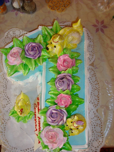 Обычно заказывала торты в Кешке-Сладкоежке, раз пять-шесть. Всех фотографий нет, но вот два: на юбилей маме и на 5 лет сыну. На юбилей их фанатзия, попросила украсить цветами, но они переборщили, на мой взгля, получилось аляповато. На ДР сыну была моя картинка.