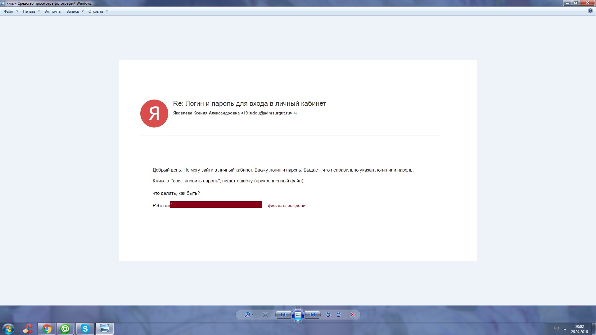 Sashulya писал(а): Блин не могу зайти в личный кабинет никак.пишет неверный логин или пароль и на почту не приходит письмо о восстановлении пароля писала на этот адрес 101udou@admsurgut.ru через пару дней пришло письмо с логином и паролем.