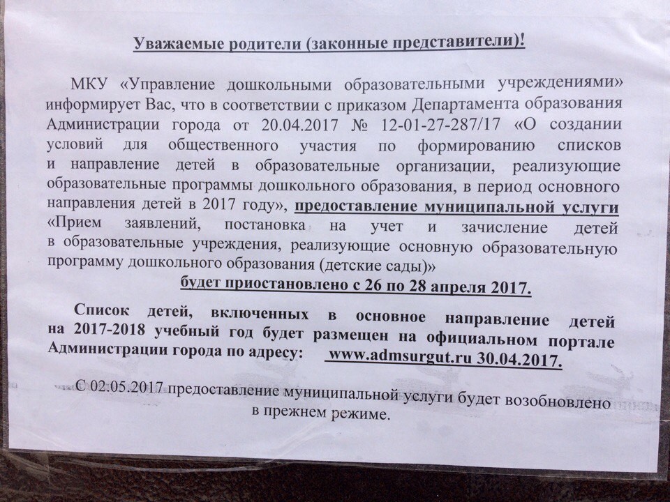 Раздел сайта "Всё про садики (УДОУ)" с самыми свежими новостями, ПРОСТО КУЧА ПОЛЕЗНОЙ ИНФОРМАЦИИ! https://detkino.ru/roditelskaya/vse-pro-sadiki-udou Как расшифровать ИКР: xx/dd-mm-yy/n Где xx - каким по счету зашел в кабинет dd-mm-yy - это день-месяц-год постановки на учет n - от 1 до 3, указывает на наличие льготы, 1 внеочередники, 2 - первоочередники, 3 - общая ВНИМАНИЕ! Изменился график работы отдела по работе с населением. Горячая линия по вопросам комплектования образовательных учреждений 8 (3462) 35-52-01, 35-52-08, 35-52-11, 23-01-16 понедельник, вторник, с 9-00 до 13-00; среда, четверг, пятница с 14-00 до 17-00. Приём населения осуществляется по адресу: ул. Дзержинского, 4/1 График приёма: Понедельник с 14:00 до 18:00 Четверг с 9:00 до 13:00 |