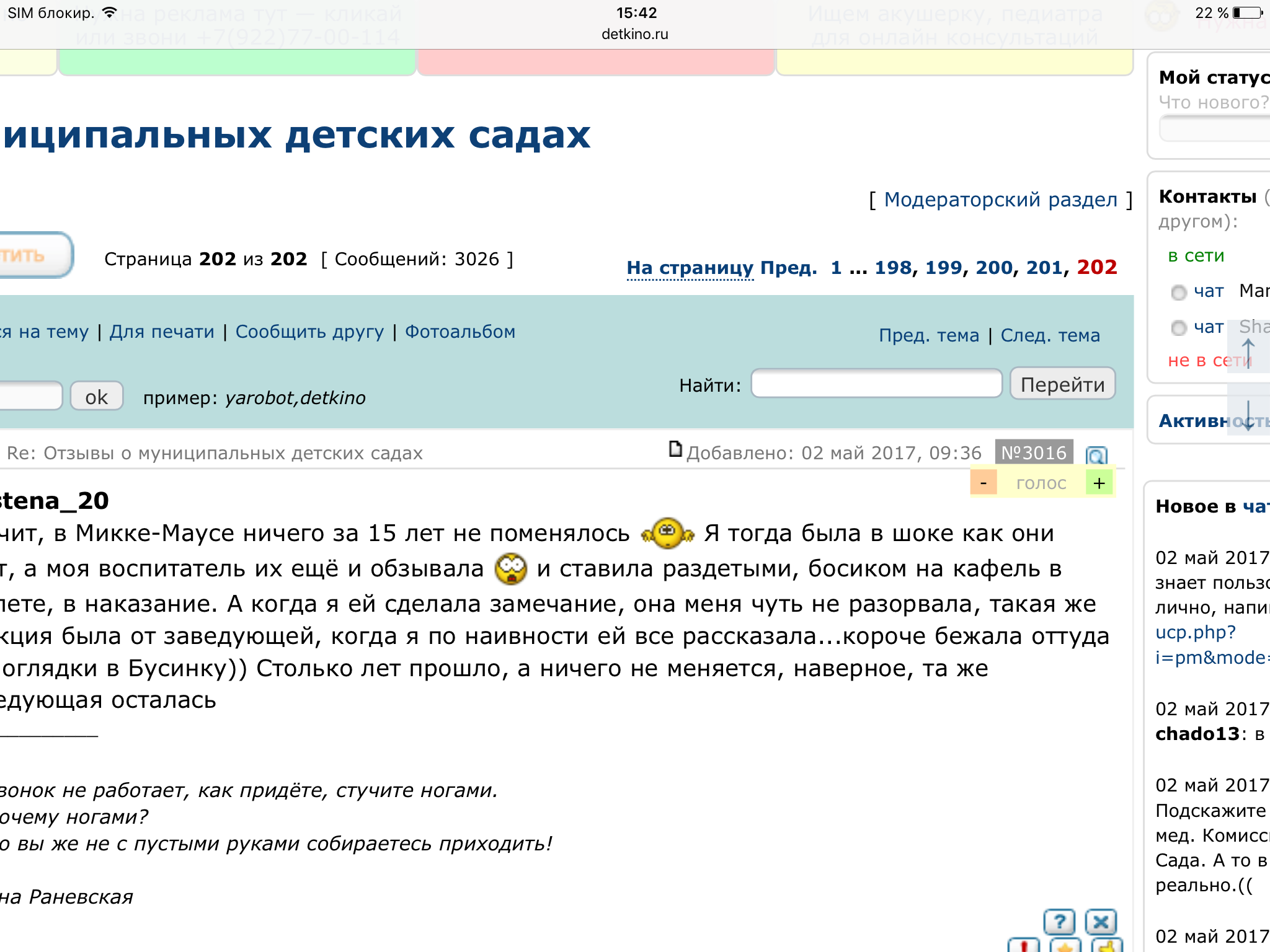 Ромашковое_поле писал(а): : 2.05.2017 10:36 Nastena_20 Значит, в Микке-Маусе ничего за 15 лет не поменялось Я тогда была в шоке как они орут, а моя воспитатель их ещё и обзывала и ставила раздетыми, босиком на кафель в туалете, в наказание. А когда я ей сделала замечание, она меня чуть не разорвала, такая же реакция была от заведующей, когда я по наивности ей все рассказала...короче бежала оттуда без оглядки в Бусинку)) Столько лет прошло, а ничего не меняется, наверное, та же заведующая осталасьЗаведующая та же, она в Микки Маусе вечная. Нам сегодня сказали что у них мест нет, пока дети не выпустятся в июне. Нахрена (извините) тогда направлять нас туда если мест нет. |