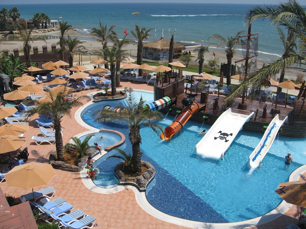 Вот с больших горок сфотографировала пирс и детский кораблик с детскими горками,ещё возле больших горок есть одна детская в маленький бассейн.