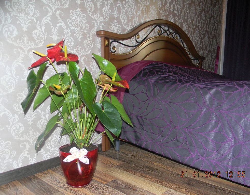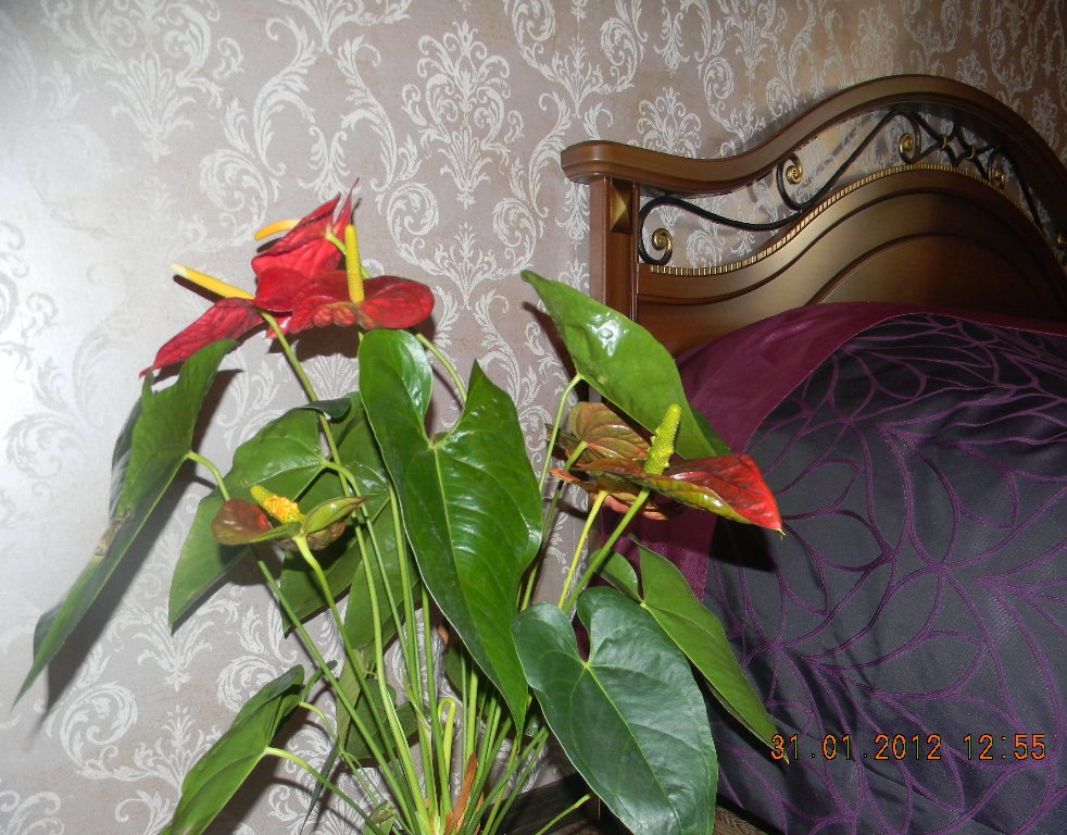 Это антуриум, женское счастье))) У меня такой же есть и белый и красный. Красный болеет постоянно и нифигашеньки не цветет. А вот белый отлично себя ведет-главное на яркое солнце не ставить и поливать регулярно. |