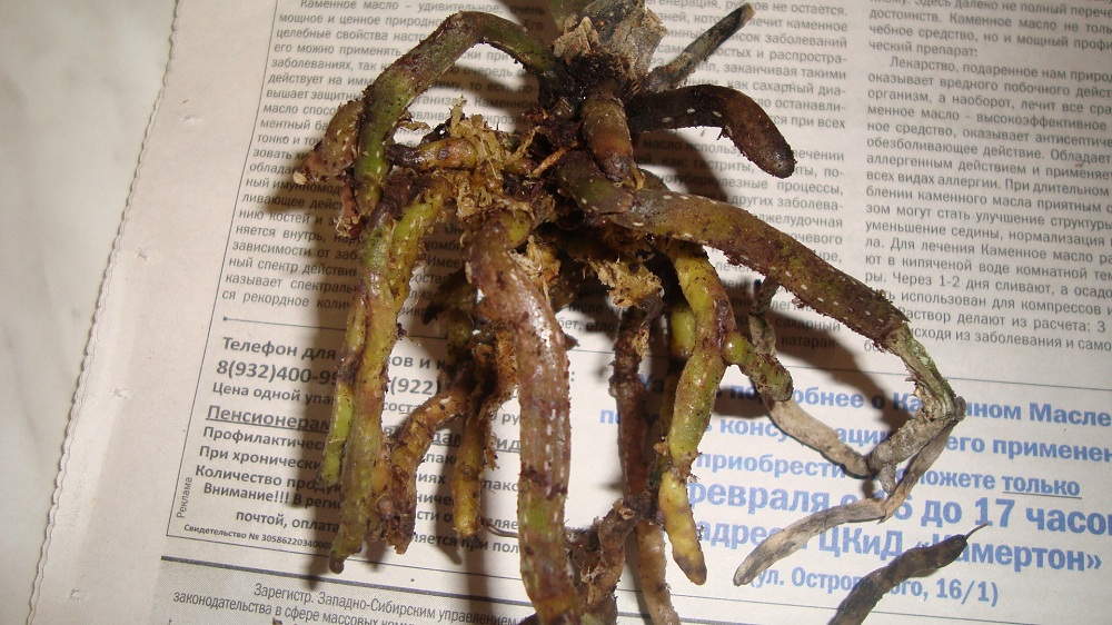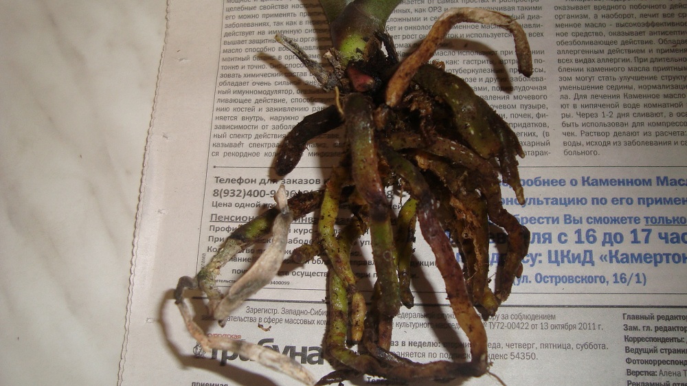 Вытащила я орхидею из горшка!Цветонос у основания был сгнивший и отпал сразу.