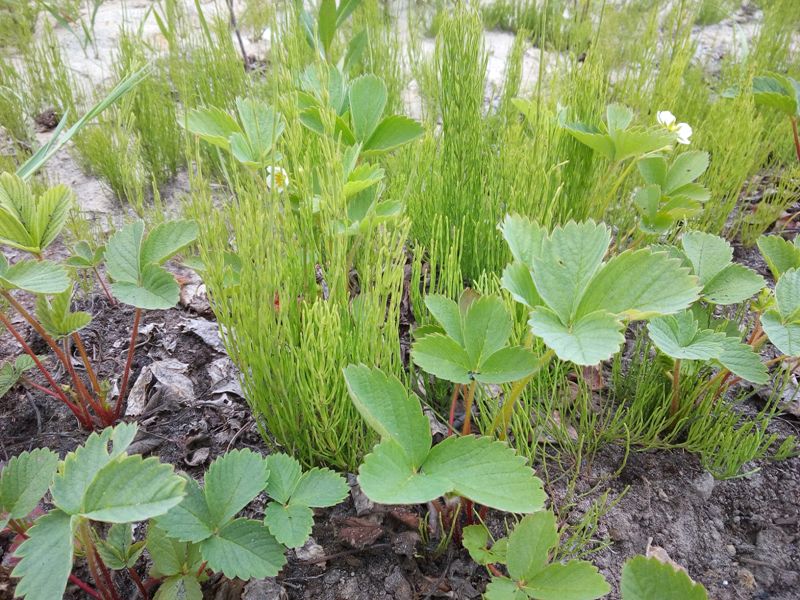 это хвощ, почва кислая, надо больше золы, извести пушонки по осени и что там еще для раскисления добавляют видимо торфа Вы добавляли? вот чего про него пишут http://ogorodnik.net/borba-s-sornyakami-xvoshh-polevoj/