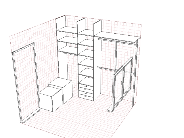 Мне кажется в Вашем случае надо хорошо подумать насчет морозильной камеры и стиральной. Смотрите грубо если я ставлю в Вашу комнату эти вещи, и начинаю прочерчивать секции, что получается в углу!!!!Конечно полки над ними и прочее...просто мне не нравится, что закрывается доступ....