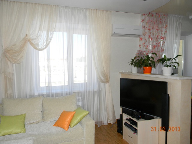 Причем основной тон тюли в цветочек белый, если бы он был бежевый, как в гостиной, то думаю было бы нормально, а так в кухне получается совсем нет бежевого оттенка.