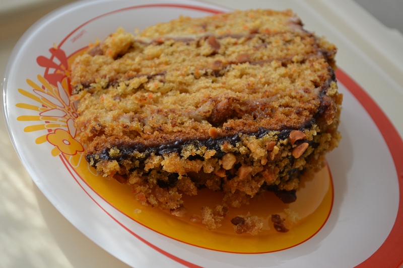Ингредиенты на форму коржей 18−19 см: 180 грамм растительного масла 240 грамм сахара 2 яйца 240 грамм муки 1 ч.л. разрыхлителя 1 ч.л. соды 0,5 ч.л. корицы 0,25 ч.л. мускатного ореха щепотка соли 250 грамм моркови 250 грамм орехов Ингредиенты на крем- Пломбир сметана 20% - 350 гр. (у меня была 25%) сахар — 110 гр. яйцо — 1 шт. масло сливочное — 120 гр. ванилин — 1,5 гр. мука — 3 ст.л. ( если берем двойную порцию теста для коржей - крема так же увеличиваем вдвое ингредиенты) Для начала нам надо подготовить наши орехи, для этого их надо промыть, высушить и поджарить на сковороде, либо в духовке до золотистого цвета. Таким образом орешки станут ароматнее. У меня был арахис но вы можете взять орехи, которые вам больше всего импонируют, к примеру кешью, миндаль. можно вполне и без них обойтись, торт вполне переживёт такую отмену в ингредиентах. После остывания орехи измельчим. я дополнительно сделала карамель для орешков. Далее, нам надо подготовить морковь, натереть её на мелкой тёрке (у меня вышло два стакана по 180 мл моркови ( 5 шт средней моркови) Если при измельчении вы видите, что образовалось много сока, то надо морковь отжать, иначе из-за лишней жидкости бисквит получится в итоге клёклым. Соединяем растительное масло с сахаром и взбиваем недолго, до объединения. Я брала тростниковый сахар, он даёт карамельный аромат выпечке. Добавляем туда яйца, по одному. Каждый раз хорошо вымешивая массу. В это время просеем все сухие компоненты — муку, разрыхлитель, соду, корицу, мускатный орех, соль. Тщательно перемешаем венчиком. В масляную смесь добавляем сыпучие ингредиенты, замешиваем тесто. Можно это сделать на малых оборотах миксера или при помощи лопатки.Затем туда же вводим морковь,( можно добавить цедру лимона или апельсина) тесто будет очень густое-так и должно быть. Обязательное условие — выпекать надо в двух формах. Всю порцию за раз нельзя выливать в одну форму. выпекаем при 160° 45 минут до сухой зубочистки) время конечно зависит от особенностей духовой печи. Готовые бисквиты вынимаем из формы, охлаждаем на решётке. Затем, разрезаем пополам, в итоге получаем 4 коржа примерно по 1,5−2 см. кожи можно обернуть пищевой пленкой и отправить в холодильник. Готовим крем. сливочное масло нам необходимо комнатной температуры, поэтому достаём его из холодильника заранее, часа за 2 до приготовления. Ставим кастрюльку на плиту, крем готовится на водяной бане, поэтому подготовьте заранее ёмкость, которая поместится в эту кастрюлю сверху. Далее в меньшей таре смешаем сметану, яйцо, сахар, ванилин и муку. Как только в кастрюле закипит вода, ставим нашу ёмкость сверху и начинаем томить массу до загустения, постоянно помешивая. У меня на это ушло всего минут 5. Но, это с вариантом в 25% жирности сметаны Крем получается очень густой как сметана по консистенции оставляем его остужаться. Для этого я поместила его в миску и прикрыла плёнкой Остужала я крем минут 30−40. Затем, взбиваем наше масло и, аккуратно, по ложечке добавляем к нему наш остывший крем, не переставая взбивать.Взбиваем долго до пышности. В итоге получаем очень плотный, устойчивый крем. Затем собираем наш торт, смазывая коржи хорошо сначала кремом Пломбир затем- готовой шоколадной глазурью ( я брала фирмы доктор Эткер). Бока так же промазываем кремом, и последний штрих- заливаем весь торт шоколадной глазурью и посыпаем орешками. - отправл