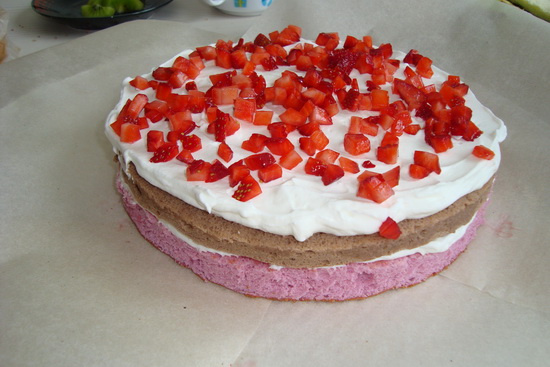 девочки вот еще мое творение, коржи бисквит со свежей клубникой и киви, были проблемы с "лепилкой" вроде так вы её называете, она не прилипала к торту