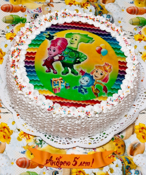 Торт с вафельной картинкой...картинка покрыта обычным сахарным сиропом с желатином,белковый крем.