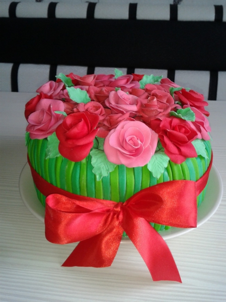Я крайние розы (чтоб не попадали) на зубочистки крепила, а которые уже все в середине просто так составляла, когда торт резала половина розочек пришлось снимать чтоб не повредить! потому что все хотели целые розочки