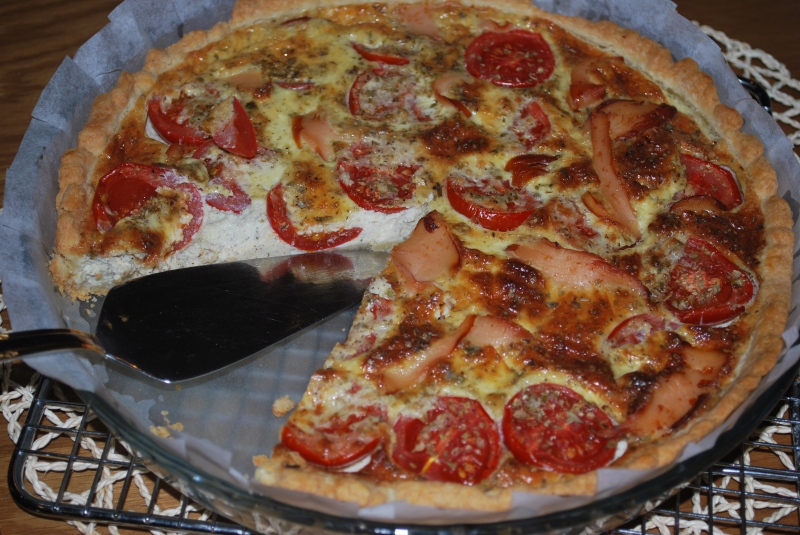 Вложение: Тесто: 25-30 г тертого на мелкой терке пармезана 150 г муки 1 яйцо 1/2 ч.л. соли 100 г сливочного масла охлажденного (порезать на кусочки) Тесто проще всего приготовить в фудпроцессоре (кухонном комбайне). Соединить муку с сыром и маслом, солью, смешать все, несколько раз прокрутив в режиме "пульс" до состояния крошки. Добавить яйцо, еще прокрутить, пока тесто не соберется в комок - не более 30 секунд. Если нет техники - не беда, то же самое делаем вручную. Мука, сыр, соль + масло, перетереть руками или вилкой до состояния крошки, добавить яйцо и замесить мягкое тесто. Не забываем - такое тесто долго не месим! Оно не любит теплых рук. Готовое тесто заворачиваем в пленку и в холодильник. Тем временем готовим начинку. Начинка: 500-700 г помидор черри 50 г пармской ветчины Заливка: 3 яйца 200 мл сливок 2 ст.л с горкой тертого пармезана 1 ч.л. сушеного базилика (базилик можно заменить на орегано) соль, перец, мускатный орех Приготовление: Помидоры разрезать на половинки, ветчину разделить на "лепестки". Сейчас почти невозможно найти пармскую ветчину, можно взять куриную пастрому, например ( в Мясном дворе продают). Не хотите, лень идти за нею специально - смело обходитесь без нее, сильно на вкусе не отразится. Круглую форму диаметром 26-28 см слегка смазать сливочным маслом и выстелить бумагой для выпечки. Достать тесто из холодильника. Раскатать его чуть больше диаметра формы, чтобы образовались бортики, уложить в форму, наколоть вилкой. Помидорки уложить, распределив по всему дну. Между помидорками выложить ветчину. Смешать заливку: яйца, сливки (я брала 20% + ложка домашней сметаны), перемешать, посолить, поперчить, перемешать. Добавить мускатный орех (потереть на терочке не больше 1/4 орешка или взять 1/4 ч.л. или чуть меньше. Не переборщить!), пармезан и базилик. Снова перемешать и вылить в форму с помидорами и ветчиной. Поставить в разогретую до 175 градусов духовку (у меня - с конвекцией) и выпекать примерно 40 - 50 минут. Смотрите по своей духовке - возможно времени понадобится чуть меньше или чуть больше. Вкусно теплым и холодным. Такой пирог удобно взять с собой на пикник. Вложение: