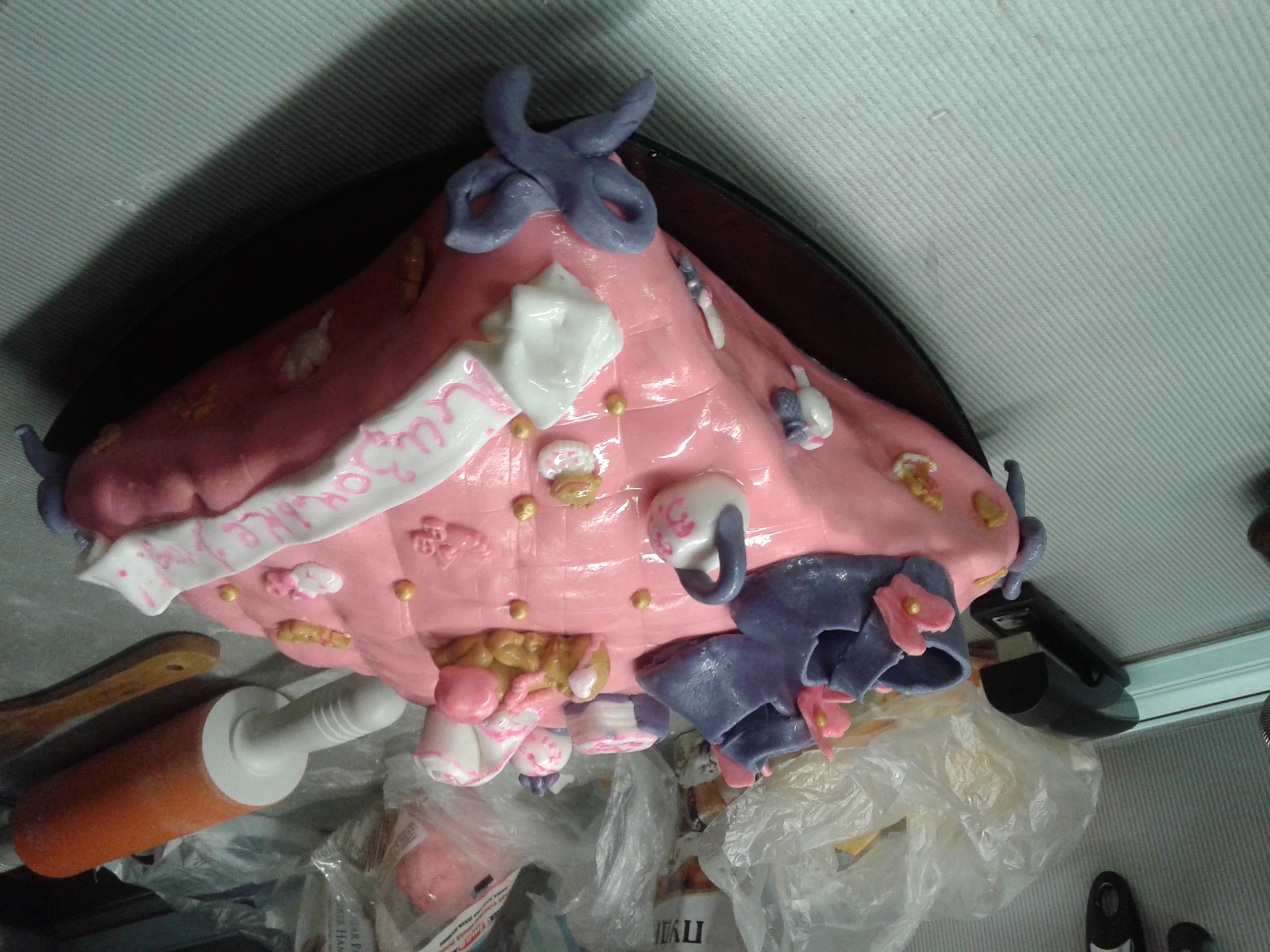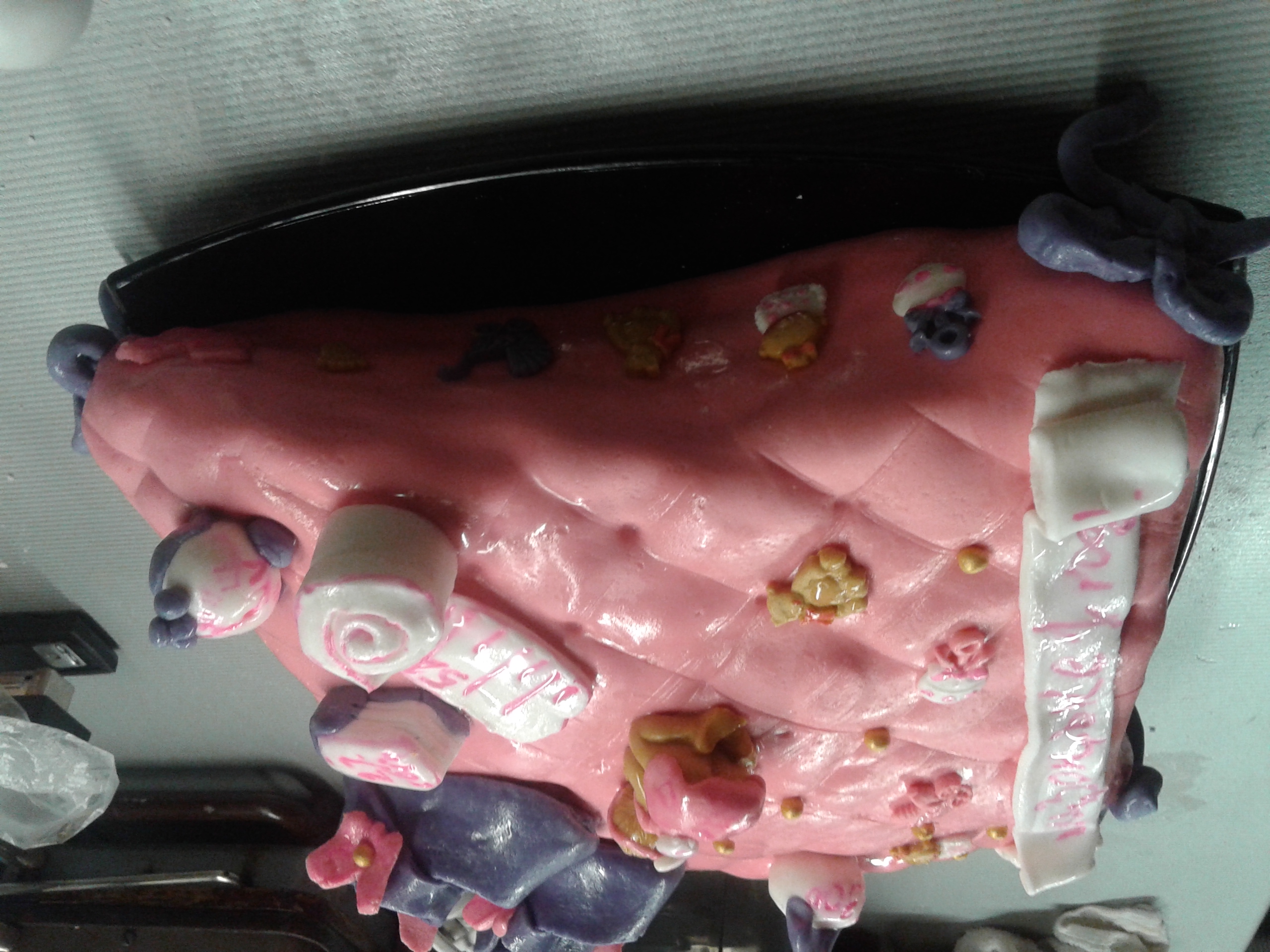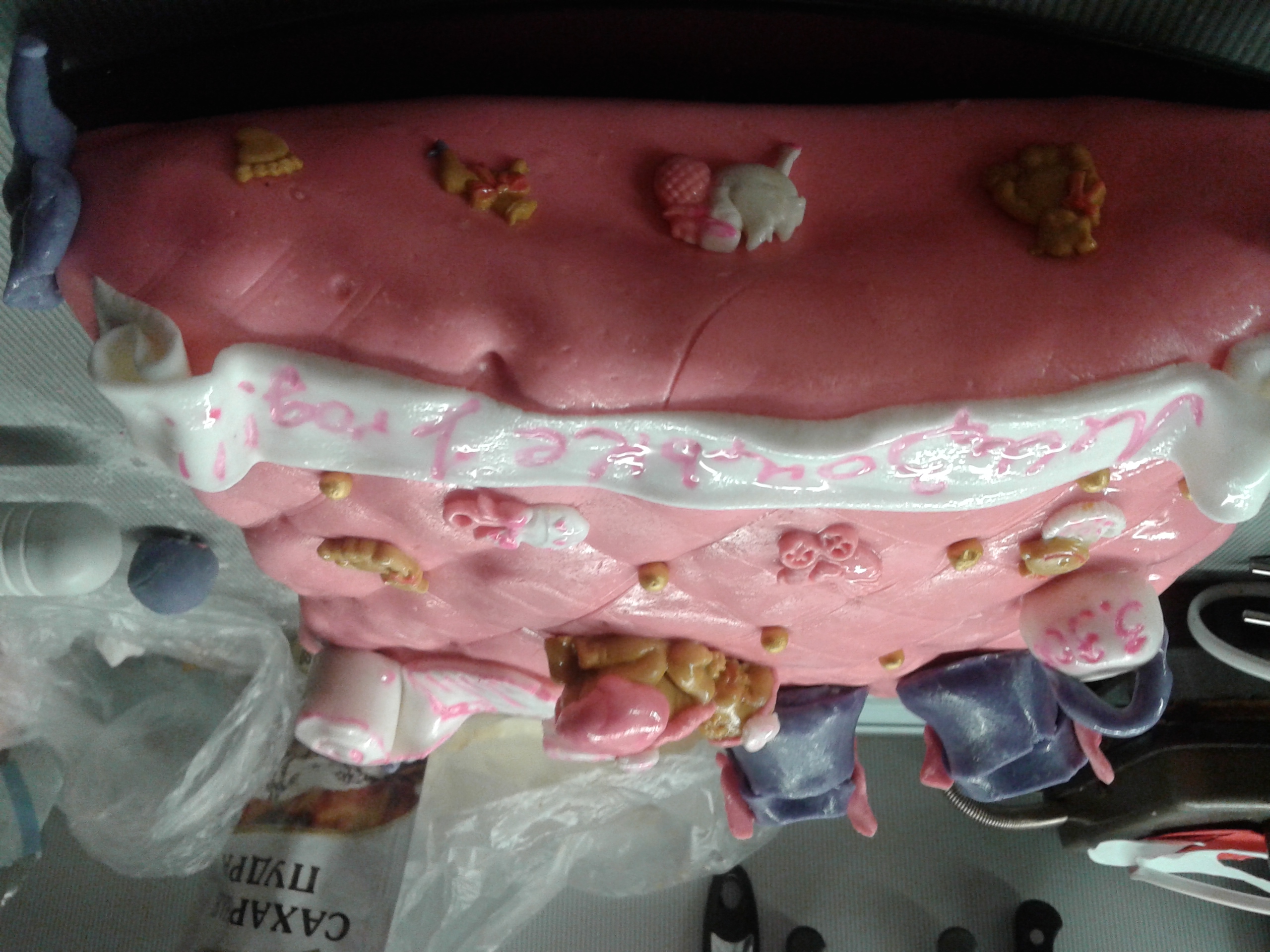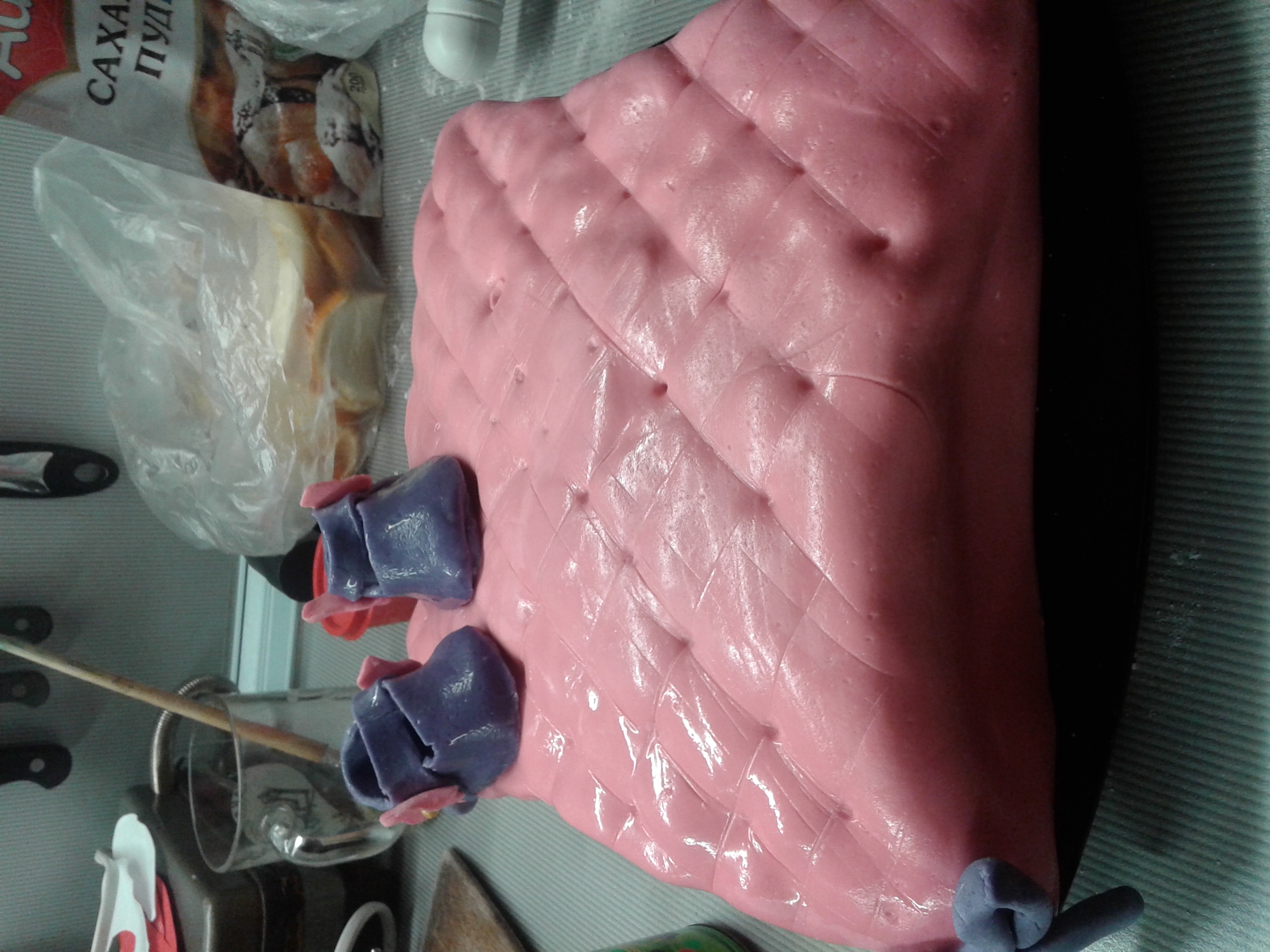 Готовила торт на годик своей доченьки. Задумка - торт в виде подушки, покрытый мастикой, сверху украшения из мастики. Разреза нет, да и фотки самого торта делались ночью, когда оформляла его. В сам ДР я мало, что успела сфоткать на тел, а фотик лети сломали окончательно.