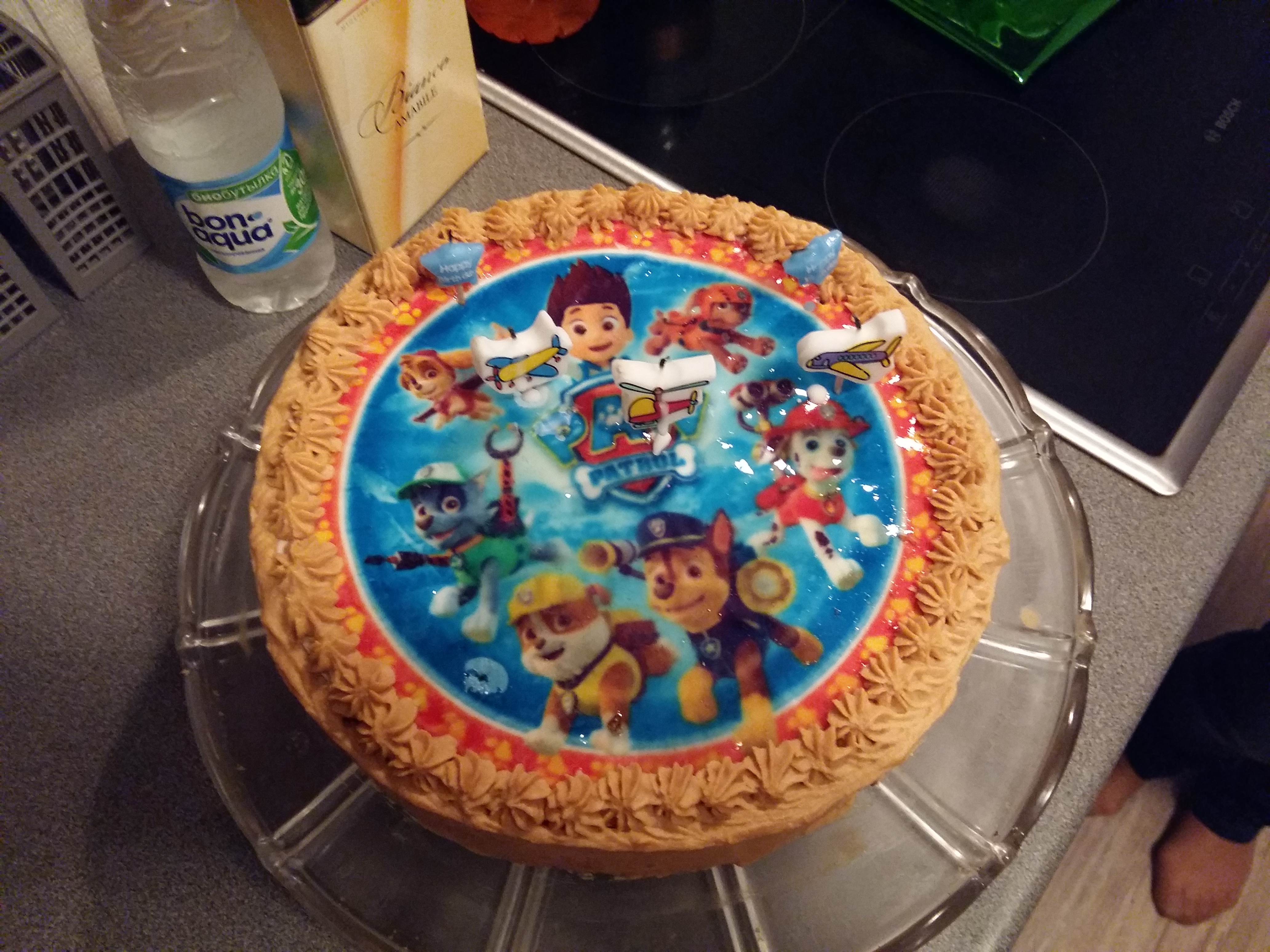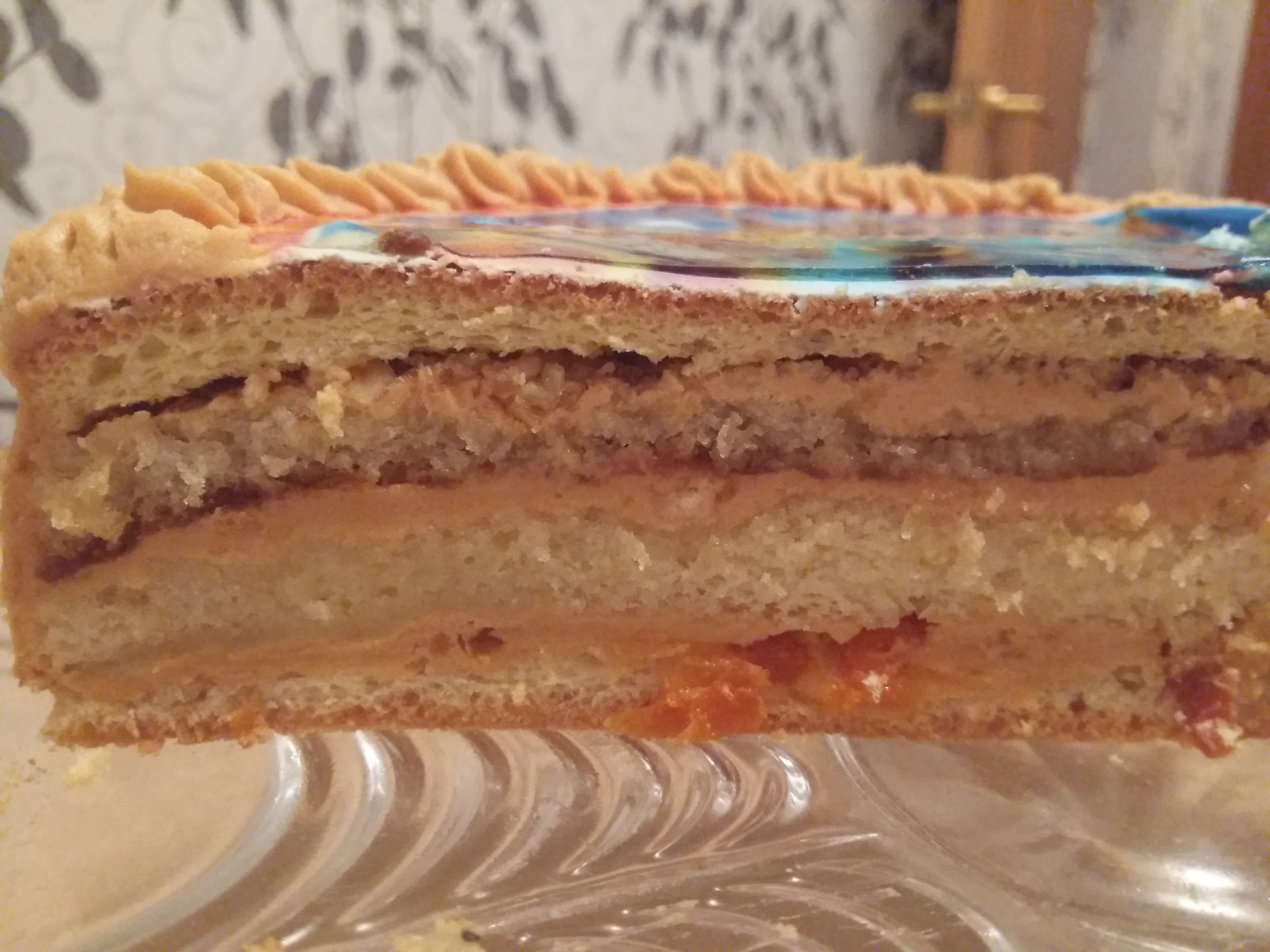 Легко и красиво.Внутри два коржа -бисквит на горячем молоке, два -классический бисквит, пропитан сиропом с лимонным соком, крем варенная сгущенка (сама варила, покупную не переношу ) с маслом и сметаной.Очень вкусный крем прослойка между коржами:1) орехи грецкие 2) зефир мелко нарезанный 3) курага .Сверху на картинку сварила декор гель по рецепту kokosim Картинку напечатала в красивом подходе.Только единственное, надо было под неё тоже крем положить, резалась она ужасно(сахарная бумага).Бисквитом недовольна, ни одним.Но это вообще не моё. Видимо форма широкая слишком на то количество тесто и не поднимается.Но получилось всё равно вкусно ![]()