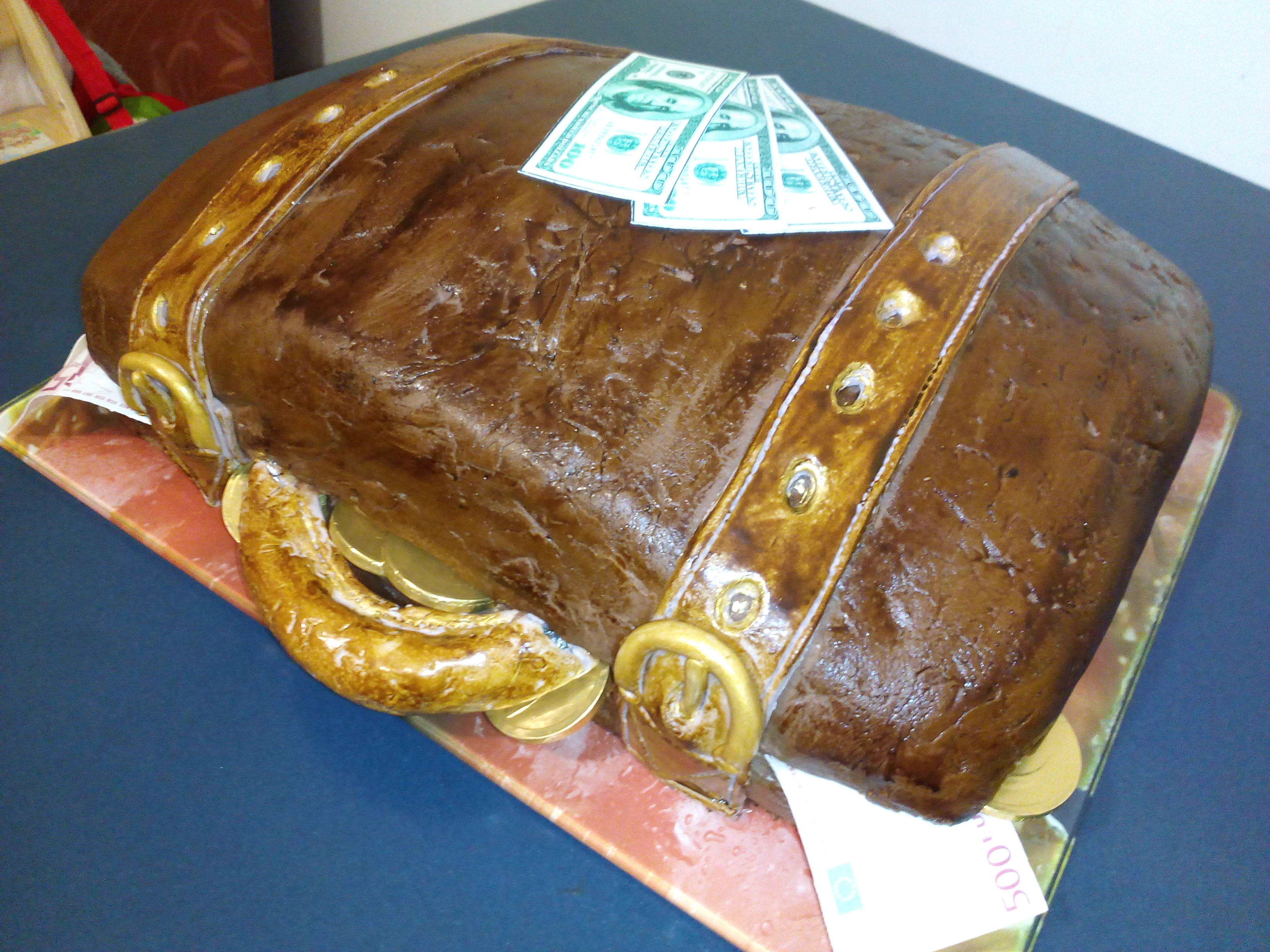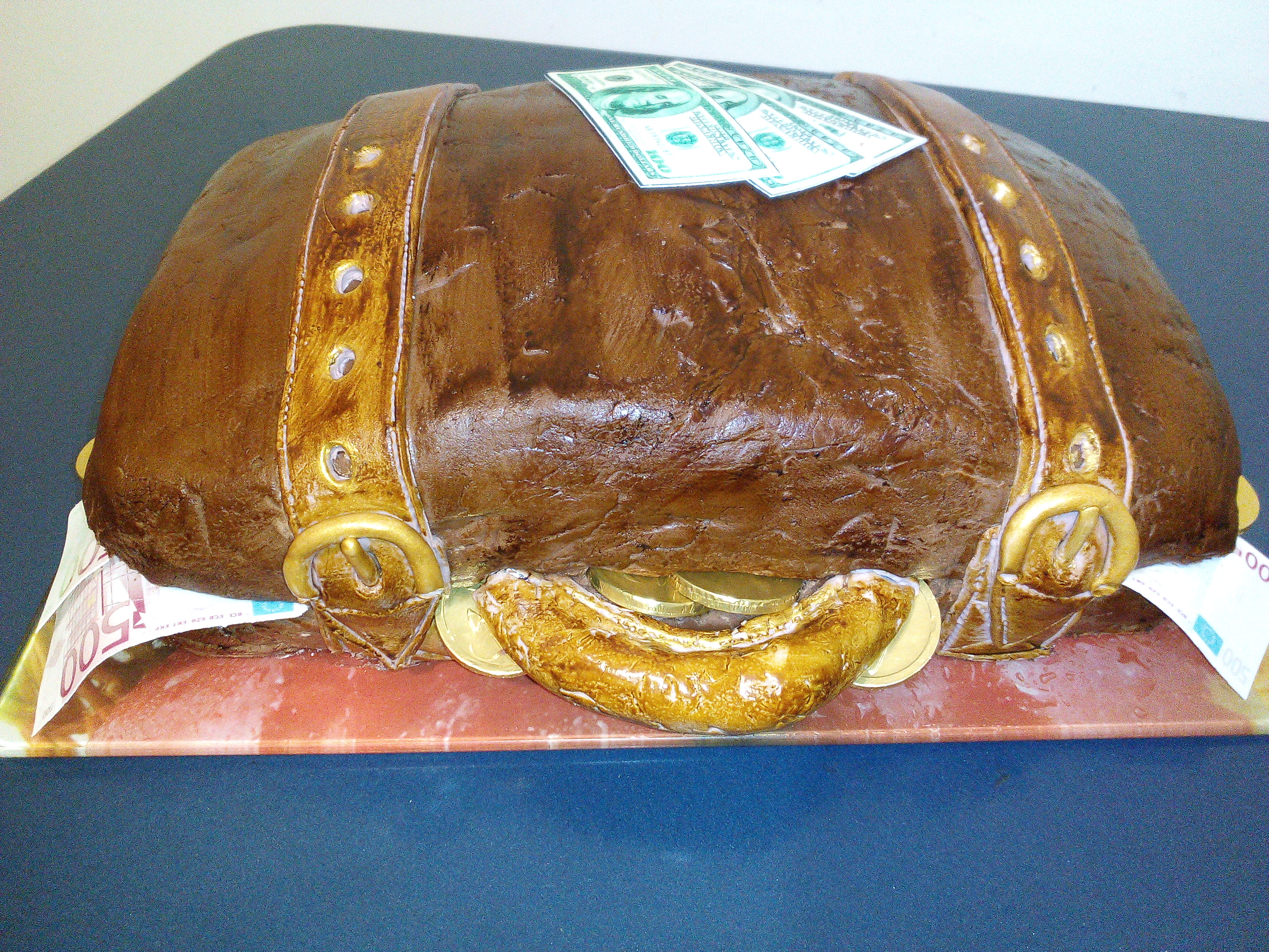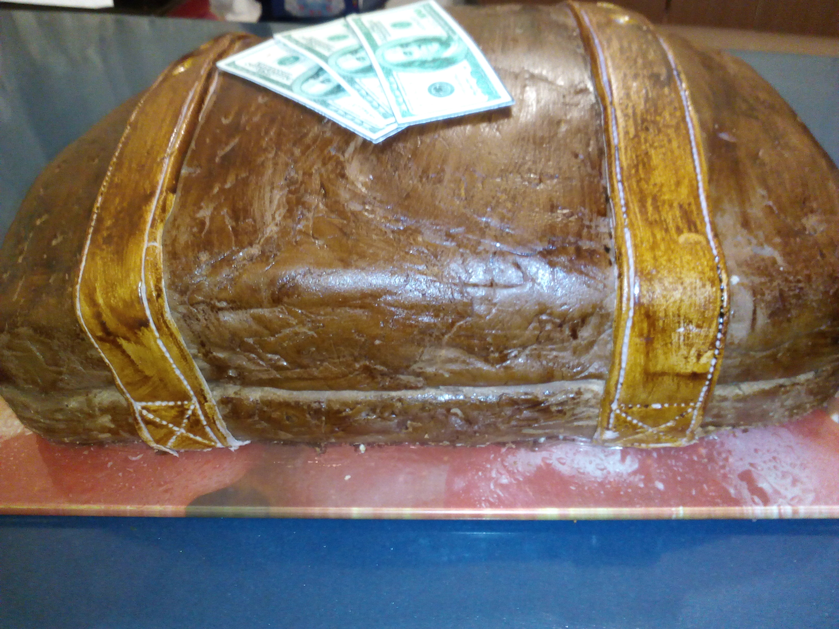 Вымучила, получился 6,7 кг. Делала Мужу сестры на ДР. Внутри медовые коржи с творожным кремом, сметанным кремом с апельсинами (желание именинника - их было практически незаметно), грецкими орехами и бананами. Снаружи шоколадная мастика, детали делала из Визьон. Проблем была куча: мастика не хотела раскатываться в большой пласт без разрывов, в результате делала заплатками; коржи по краям осели, но для чумадана как и форма, и текстура подошли как нельзя лучше. Перед самым выходом после того, как я втыкнула последние монеты, отвалилась ручка я ее делала из фольги, обтянутой мастикой. Втыкнула туда зубочистки, до подачи имениннику додюжила.Девочки, подскажите чего ж сделать с этими краями и с мастикой? До сих пор не могу найти для себя нормальный рецепт домашней мастики. Деньги печатала в красивом подходе на сахарной бумаге. Впечатление двоякое, вроде она и пластичная, но пока до дома несла в пакетике по краям всё обкрошилось Видела такие картинки в красивом подходе, но сказали, что это уже старые и им 1-2 недели.