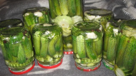 я огурцы последние лет пять делаю только с лимонной кислотой. С стерильные банки кладу листочек черной смородины, зонтик укропа и немножко зелени укропа, кусочек листика хрена, несколько чесночинок, плотно укладываю огурчики (предварительно вымытые, краюшки чуть срезаю), три-пять горошков черного перца, 1 ст.ложка сахара (без горки), 1 ст.ложка соли (без горки) крупного помола (на 1литровую банку, если брать трехлитровую, то соответственно 3х3), залить кипятком, постоит минут 10-15, слить рассол в кастрюлю (сливая, взбалтывать банки, чтобы сахар и соль растворились), добавить немного воды (потому как при нагревании и кипении часть рассола испариться, может не хватить на последнюю банку). В кастрюлю с рассолом добавляю 1 ст.ложку лимонки (на 5 литровую кастрюлю), закипел рассол, заливаю банки с огурцами и закрываю винтовыми крыжками, можно и ключом закатывать. На ночь перевернуть вверх дном и укутать в теплое одеяло или плед. Получается вкусненько, хрустящие ![]() Вложение: только что с пылу с жару...