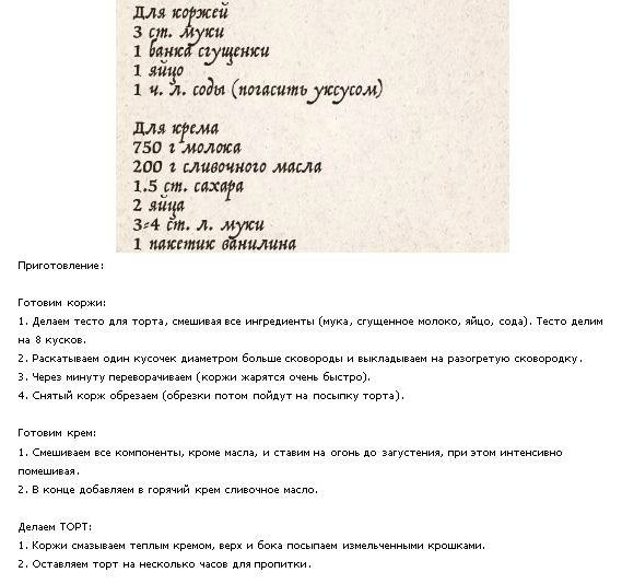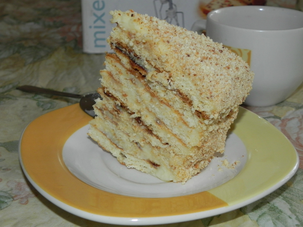 Тесто: 1 ст. молока подогреть добавить 100 гр. сл.масла или маргарина, растопить, перемешать. 1 стакан сахара взбить с 1 яйцом Молочно-масляная смесь должна быть немного горячее теплого состояния (это важно, мука, которую вы потом добавите должна немного завариться), взбивая ее постепенно добавляем взбитый сахар с яйцом. Добавить 1 ч.л. соли и 4,5 ст. муки, хорошо вымешать. тесто не получится крутым, но оно будет довольно не сложно раскатываться до тончайшего состояния. Тесто делим на 14 кусочков, рабочую поверхность присыпаем мукой (можно раскатать сразу на бумаге для выпечки). Заранее подумайте в какой форме вы будете собирать торт и приготовьте трафарет (тарелку, крышку и т.д.) по чему вы будуте обрезать тесто. Тесто раскатываем до тончайшего состояния (если разделить на 12 кусочков, получится больше обрезков). Духовку разогреваем до 180-200 гр. и начинаем печь, предварительно наколов тесто вилкой, От духовке не отходите, коржи пекутся очень быстро. Готовый корж сразу же обрежьте по трафарету, через минуту он станет хрупким и может раскрошиться. Готовые коржи складывать друг на друга на ровную поверхность. Крем: 2 литра молока 6 желтков 1,5 ст. сахара ваниль 4 ст.л. муки Все взбить и поставить варить, постоянно помешивая. Через какое-то время крем начнет густеть, когда он станет как очень жидкая сметана снять с огня. Дать немного остыть и добавить 100 гр. масла, взбить. Коржи будем промазывать теплым кремом. Форму застилаем фольгой так, чтобы крем не вытек и оставляем края, чтобы торт можно было завернуть. Кладем корж и мажем кремом и т.д. Крема у вас много и по идее вы должны весь его потратить, потому как это "мокрый Наполеон.На каждый корж должно уходить не меньше 6 ст.л. крема. У меня уходило 9-10 ст.ложек. На коржи давить не надо, намазали, аккуратно положили следующий. Так как крем жидкий, то он будет немного вытекать. Последний корж так же смазываем кремом и посыпаем измельченными обрезками. По бокам торта (должен оставаться обязательно зазор, торт распухнет), прямо в стекший крем тоже насыпаем измельченные обрезки и слегка их утопляем. Оставьте немного обрезков, потом, после пропитки торта вы украсите ими бока. Торт хорошо запакуйте фольгой и поставьте в холодильник. Торт должен обязательно хорошо пропитаться, он немного разбухнет и станет очень мягким и мокроватым. Лучше, чтобы он постоял не меньше 10 часов. Готовый торт достаньте, разверните фольгу. Удобнее делать этот торт в круглой форме с разъемными бортами, тогда вы просто снимите кольцо, обсыпьте края отложенной крошкой, дадите немного крошке пропитаться, разрежете и переложите на тарелку. Если вы делаете в прямоугольной форме, то доставать сложнее. Разрежьте торт, аккуратно выньте кусочки и переложите на тарелку (первый кусок не очень удобно вынимать), украсьте крошкой те края, что соприкасались с бортиком, дайте пропитаться . |