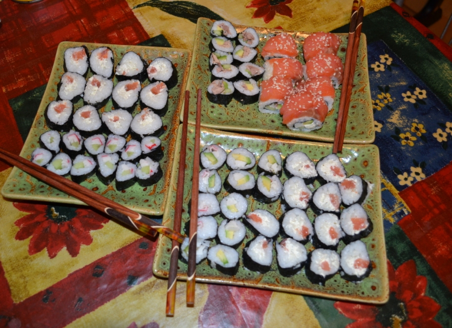 Я сегодня тоже решила попробовать сделать роллы. Купила набор для суши. А рис сварила в скороварке-мультиварке Мулинекс, воды 1:1, 8 мин на низком давлении и отличный рис готов. Конечно не совсем круглые получились, но вот как-то так... Кстати, роллы наизнанку мне понравилось больше крутить.
