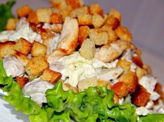 ИНГРЕДИЕНТЫ: ● 500 г куриной грудки; ● 500 г шампиньонов; ● 500 г пекинской капусты; ● 3-4 огурца; ● майонез для заправки; ● хлеб и чеснок для сухариков; ● растительное масло ПРИГОТОВЛЕНИЕ: Сырое куриное филе нарезаем полосками и обжариваем на сковороде до золотистого цвета.Куриное филе нарезаем полосками и обжариваем на сковороде до золотистого цвета.Шампиньоны тщательно промываем. Кладём грибы в холодную воду, когда вода закипит уменьшаем огонь и отвариваем до готовности (приблизительно 8 - 10 минут). Затем разрезаем на 4 части. Шампиньоны отвариваем и разрезаем на 4 части. Пекинскую капусту мелко шинкуем. Огурчики нарезаем средними полукольцами. Все подготовленные компоненты соединяем, заправляем салат майонезом и перемешиваем. Теперь делаем сухарики для нашего салата с куриной грудкой и грибами Хлеб нарезаем кубиками. Отправляем в разогретую духовку, пока хлеб не подсушится. Высыпаем сухарики в кулек. Заправляем сухарики смесью подсолнечного масла и выдавленного чеснока (количество чеснока по вкусу). Завязываем кулек и тщательно несколько раз его встряхиваем, чтобы наши сухарики пропитались смесью растительного масла и чеснока.На блюдо выкладываем наш салат. |
