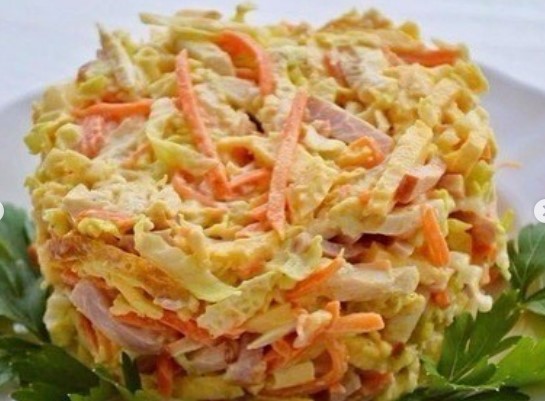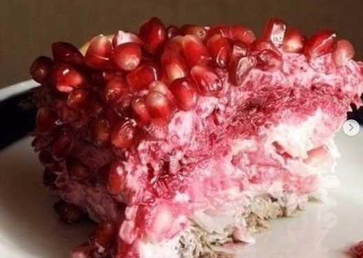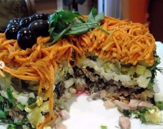 ):слоями 1 - отварная говядина + грецкий орех (между двух листов бумажного полотенца скалкой измельчаю), перемешиваю, сверху брусника, еще сверху маринованный лук; 2 - свежая морковь (тертая) + майонез; 3 - плавленый сыр (беру обычно Дружбу) + майонез; 4 - вареное яйцо + майонез. Делаю обычно в небольшом салатнике т.к. сытный очень. Рекомендую.