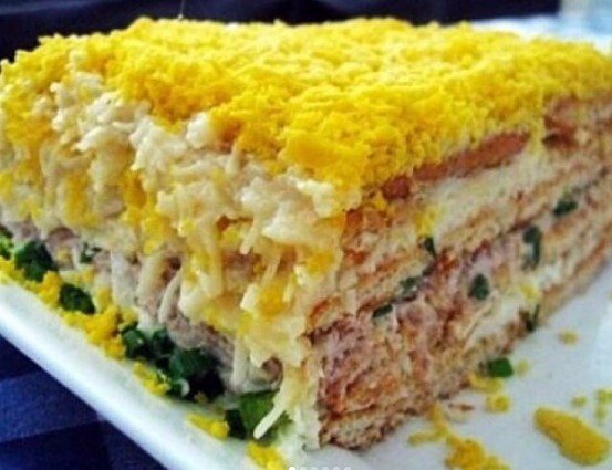 ИНГРЕДИЕНТЫ: ● круглые крекеры (несладкие) — 2 пачки ● рыбная консерва (горбуша, тунец, сайра в масле, можно крабовые палочки) — 1 банка ● яйцо — 4-5 шт. ● майонез ● чеснок — 1-2 зубчика ● лук зеленый ● сыр твердый ПРИГОТОВЛЕНИЕ: Выложить на тарелку слой крекеров, сверху натертые на терке и смешанные с майонезом яичные белки (желтки оставить для украшения), опять слой крекеров (чтобы между ними было как можно меньше просветов), сверху слегка смазать майонезом, затем положить слой размятых вилкой консервов (жидкость слить), посыпать зеленым луком. Снова слой крекеров, затем смешанный с чесноком и майонезом тертый сыр. 2) Салат «Изабелла» Вложение: 2) Салат Изабелла