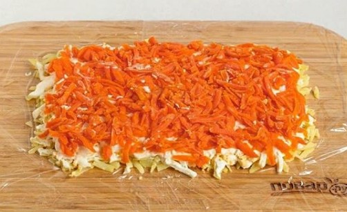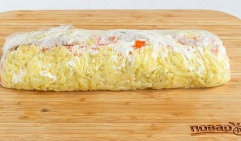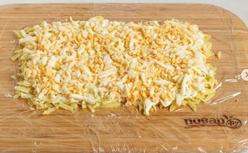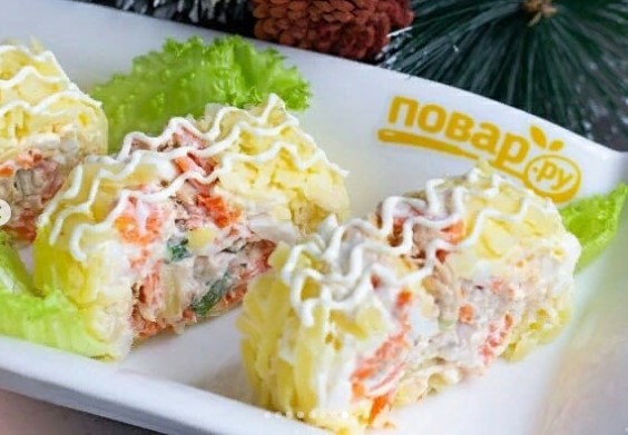Вложение: ✳Ингредиенты: Горбуша консервированная — 250 г Картофель — 3 шт Морковь — 1 шт Яйцо — 3 шт Лук зеленый — Пучок (небольшой) Майонез — По вкусу Соль — По вкусу Салат листовой — По вкусу (для подачи) Количество порций: 8-10 ✳Как приготовить: Подготовьте все необходимые ингредиенты. Картофель, морковь и яйца заранее отварите в подсоленной воде, остудите и очистите. Досочку застелите пищевой пленкой, на нее будем выкладывать салат в виде прямоугольника. 1 слой: вареный картофель натертый на крупной (можно мелкой) терке и майонез. 2 слой: натертые яйца. 3 слой: натертая вареная морковь и майонез. Горбушу очистите от костей и кожи, разомните вилочкой. Выложите четвертым слоем и сверху немного майонеза. Завершаем небольшим количеством зеленого лука. Теперь аккуратно с помощью пленки подтяните салат вверх к середине с одной и с другой стороны, кончики также прикройте пищевой пленкой и уберите в холодильник на несколько часов. Затем с помощью острого ножа разделите на порции и подавайте к столу на листьях салата.
