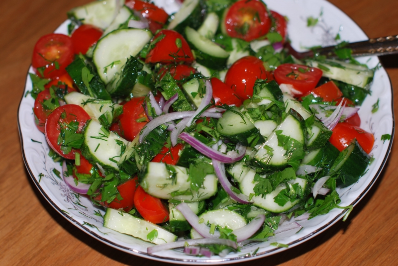 Жареная картошка с грибами + салат из огурцов и помидор + маринованная капуста.
