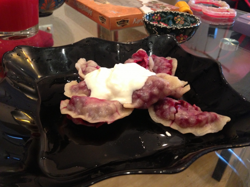 Оооо! Это такая вкусняшка! Почти вареники с вишней. У нас грибной суп с перловкой и жареная куриная печень. И вареная кукуруза.