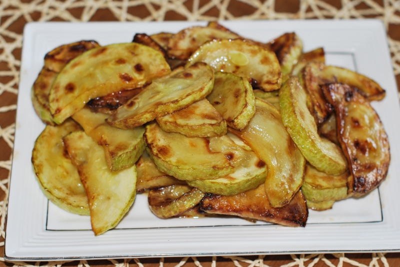 Жареный кабачок без панировки ( девочка с Деткино угостила - спасибо ей), макароны с говяжьими антрекотами и луком, гратэн (если хотите - запеканка