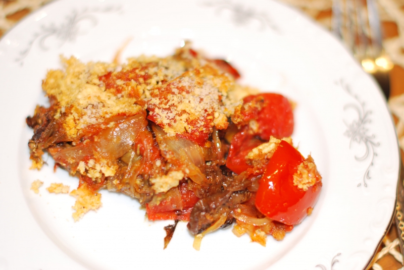 Вообще не заморочно. По количеству только не подскажу - это кто как и на сколько человек готовит. Баклажаны порезать кружочками, если очень толстенькие, то можно полудисками по сантиметру шириной. Смазать с обеих сторон оливковым маслом, выложить на противень, посолить. Можно поперчить, а можно посыпать травками - например, прованскими, или базиликом. Запекать при 200-220 градусах до легкой румяности. У меня в этот раз ушло 8 шт. среднего размера на два слоя гратэна. В этот раз я их очистила от шкурки, обычно не чищу. Не нужно ждать, чтобы они пустили сок, смазать - и на противень. Пока запекаются баклажаны, на сковороду с оливковым маслом выложить нарезанный "перьями" (половинки луковицы резать вдоль) лук, обжарить до прозрачности, добавить 2-3 дольки рубленного чеснока, по желанию острый перчик (в оригинале - пепперончино), посолить и поперчить. Помидоры крупно порезать и выложить в лук, пусть потомятся до мягкости, пустят сок. Помидор тоже должно быть достаточно на два слоя и еще немного. Нужны будут хлебные крошки. Я хлеб оочень редко выбрасываю. Когда он хорошо зачерствеет, я его запускаю в фупроцессор (кухонный комбайн?) и измельчаю в крошку. Пересыпаю в пакет и храню в морозилке. Потом использую на шницели, добавляю в котлетный фарш, запеканки и т.д. Когда баклажаны готовы, берем форму для запекания и на дно выкладываем 1-2 ст.л. помидорной смеси. Дальше очень плотно - один к одному - слой баклажан. Сверху снова помидорная смесь. Ее посыпаем хлебными крошками (в оригинальном рецепте к хлебным крошкам добавляется перец чили, но я не добавляю - пепперончино, хоть и малюсенький, дает ооочень приличную остроту. Если кому нельзя или не нравится, то и не стОит). Снова слой баклажан - помидорная смесь - хлебные крошки. И сверху посыпать тертым пармезаном. Много сыра не надо. Запекать в духовке при 200 градусах минут 25. Это рецепт Лауры Колдер из передачи "Французская кухня у вас дома-2".