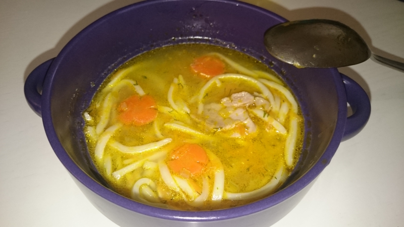 Суп штрудли с перепелкой + картофельное пюре с котлетами из индейки и свежими огурцами.