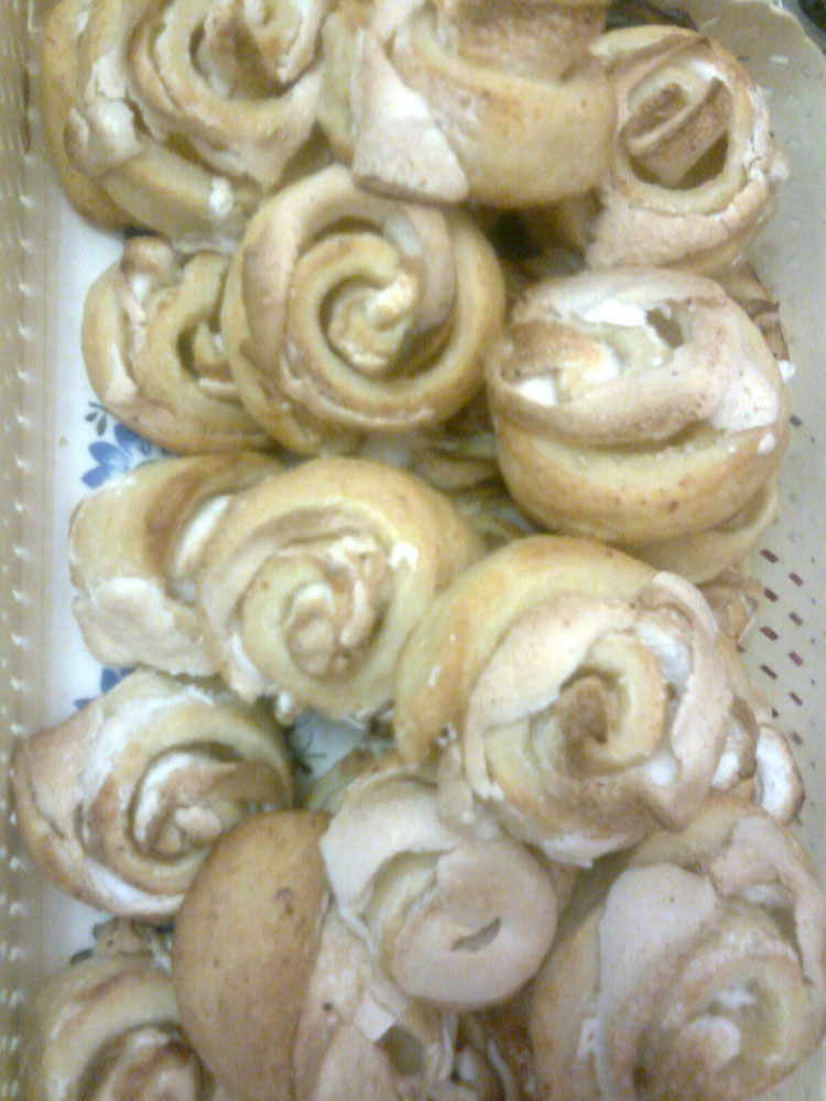 На стол высыпаем муку,в нее трем на терке пачку маргарина или масла,все перетираем,тоже делаем добавив творог. Получается крошкообразная масса.В ней делаем лунку и вбиваем в нее 1 целое яйцо,2 желтка.Перемешиваем до однородной консистенции.Кладем в холодильник на 30мин.В это время взбиваем 2 оставшихся белка с 1 стаканом сахара в густую белую пену. Достаем тесто,делим на 5 частей.Берем по одной части и раскатываем пласт толщиной 0.3-0.5 см. Мажем белковой массой,сворачиваем в рулет и режем на кусочки длиной примерно 6-8 см.Дальше действуем быстро-Обмакиваем одним срезом в муку и выкладываем на противень,смазанный маслом. Ставим в разогретую до 200-250 гр.духовку на 20-30 мин.