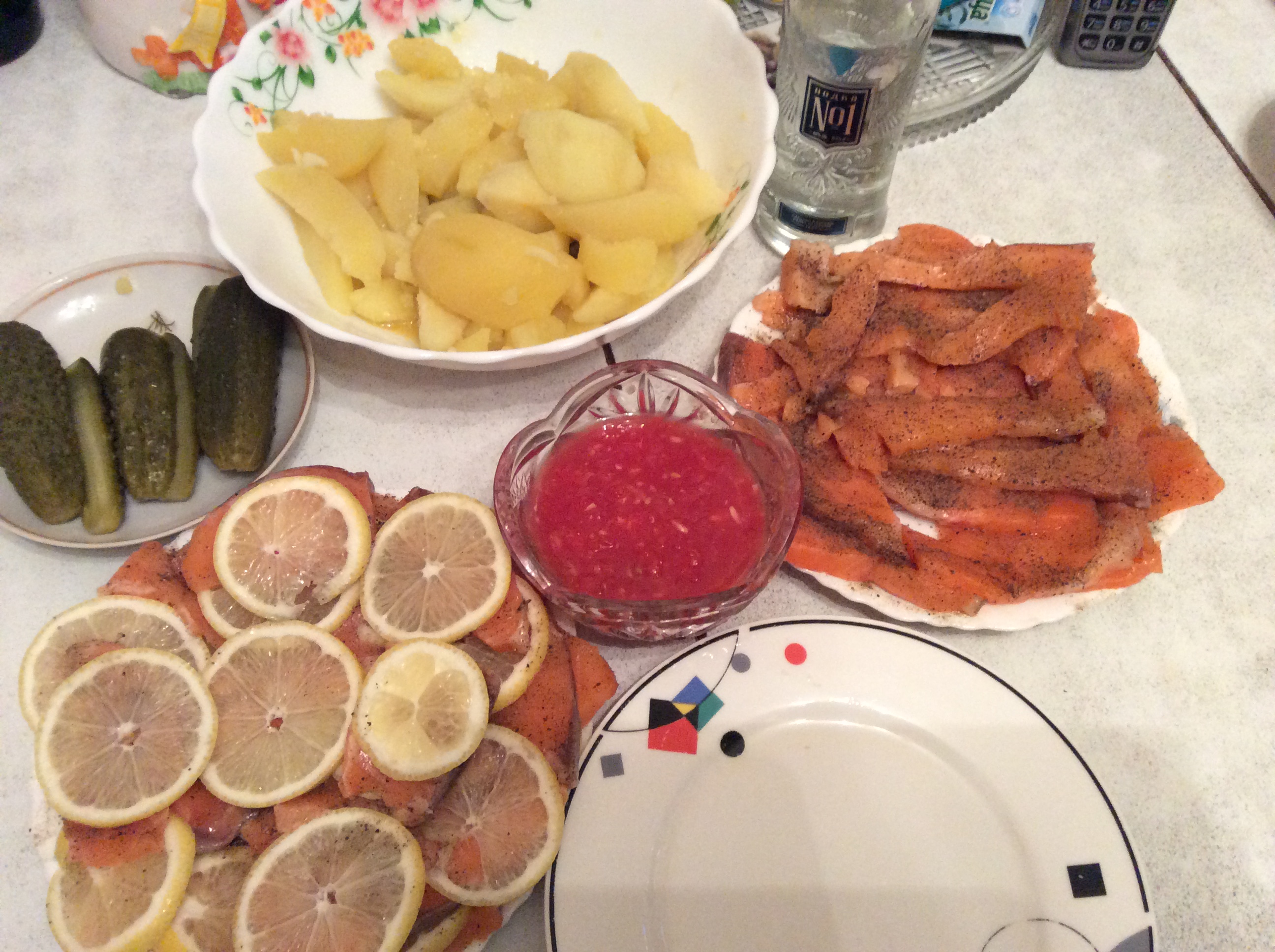 У меня ужин картошечка, рыбка семга с лимоном и без него, огурчик, аджичка