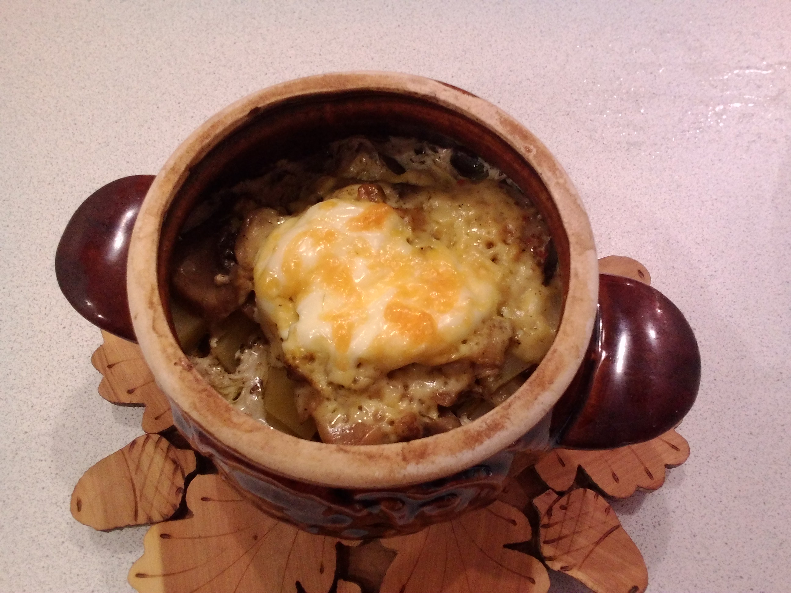 У нас сегодня блюдо в горшочках: куриная грудка, картофель, грибы, сыр со сливочным соусом.