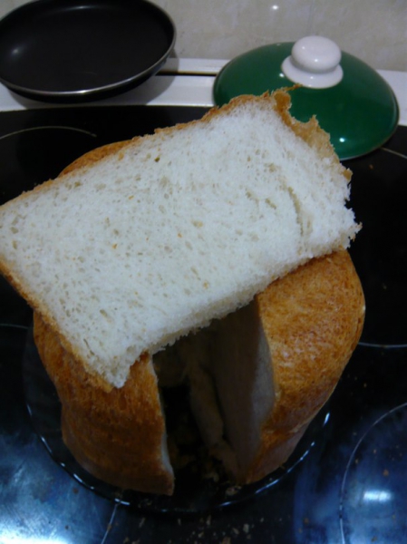 обычный хлеб,мука соль сахар дрожжи и подсолнеч.масло,но получается не всегда надо хорошую твердую муку макфа или например царь,а то хлеб будет как сырым,домашние к такому хлебу равнодушны,а вот те кто никогда не пробовал ну просто в восторге