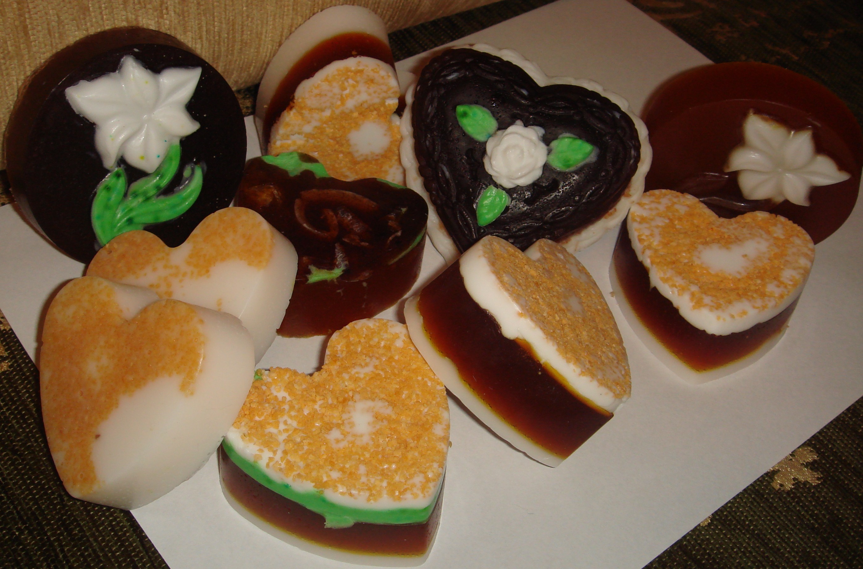 Вот, что у меня получилось. Большие мыла изновых силиконовых форм, поэтому плучились коряво, еще не првыклк нм, да и времени надо побольше, что бы до ума довести. Но, все равно, мой самый преданый фанат - моя дочь, очень любит мои творения