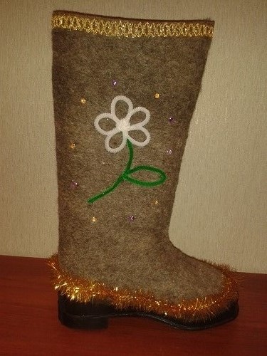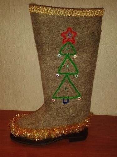 Нам давали задание в дет.саду украсить любой валенок. А мы воспитателя предупреждали, что валенок будет большой 42-го размера и резиновой подошвой