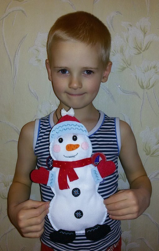 Елочка делается элементарно - сворачивается конус из бумаги (я брала А4), оборачивается фетром, закрепляется (я пришивала). Затем на нитку нанизала бусины, обернула ёлочку, и между ними нашила шарики из фольги. Звезда вырезана из того же фетра. Для снеговика делается выкройка из бумаги (стандартные три шарика разных размеров), по выкройке вырезается фигура. Передняя часть из тонкого белого фетра, задняя из толстого голубого (исключительно в целях экономии белого фетра ). Более мелкие детали (шапочка, рукавицы, валенки, пуговицы, шарфик) вырезала на глаз. Потом обшила стеклярусом и бисером то, что хотела обшить, вышила детали лица (нос-морковка и глазки тоже фетровые, для объема). Соединила все детали вместе, сзади сделала петлю, и немного набила снеговичка ватой. Рукавички и валеночки тоже хорошо бы набить, я вырезала просто из толстого фетра ![]() |
