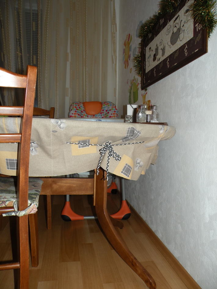 у меня была идея - пришить на скатерть и в аналогичных местах приклеить на торцы столешницы отрезки ленты-липучки (для стирки удобнее, если на скатерти мягкая половинка будет). Но пока так и не воплотила ее.. ![]() |