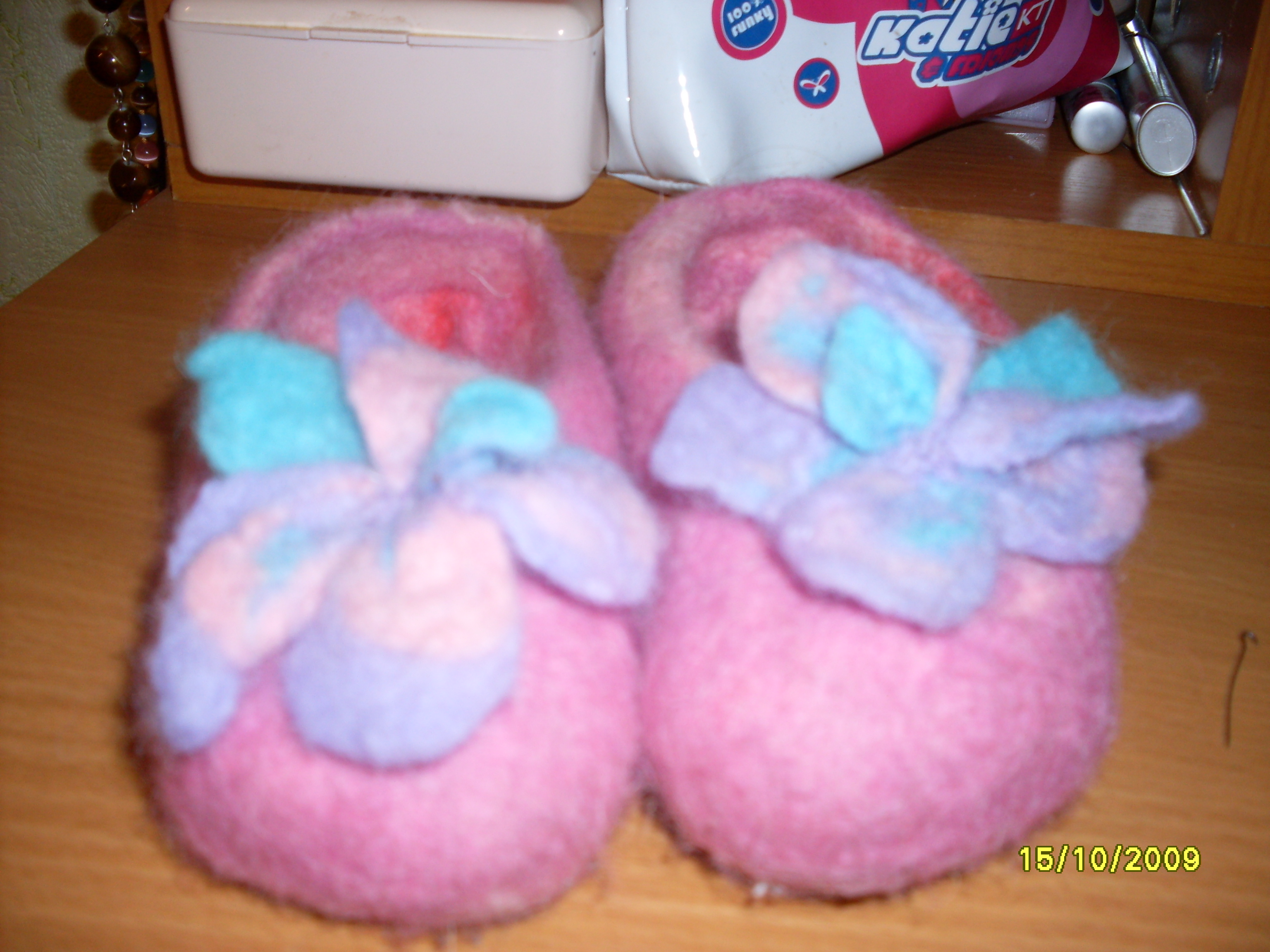 Нет, сначала шерсть основу дешевую накладывала, потом цветную - основу, потом выкладывала рисунок, потом все мочила горячей мыльной водой, накладывала сетку и уваливала руками, где-то по 50 раз в кадфом направлении, потом с изнанки - без сетки, мотом месила как тесто, потом попеременно опускала в горячую - холодную воду, последняя -хололдная