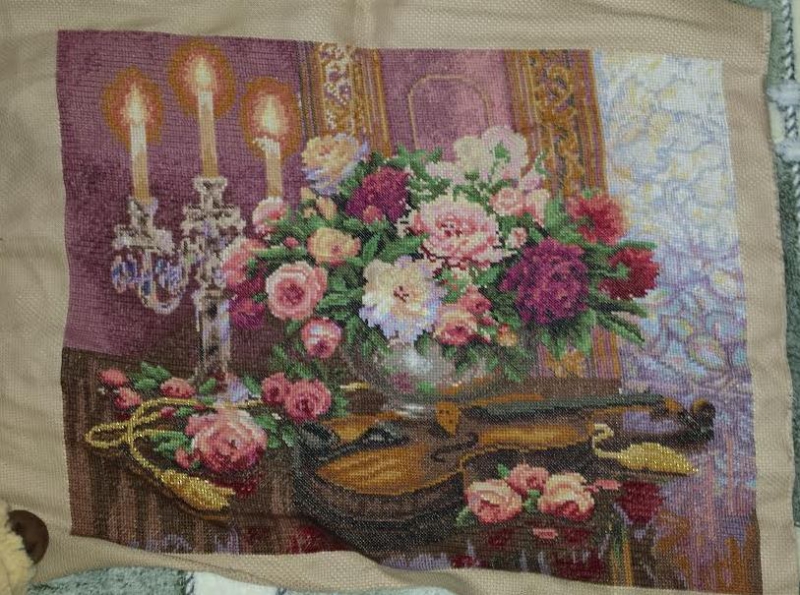 40*31 примерно. Лень искать, мне без упаковки принесли, набери в гугле "скрипка и цветы дименшен". Вышиваю, когда мелочь спит - 2 раза днем по чуть-чуть и когда уложу на ночь - час/два сижу. |