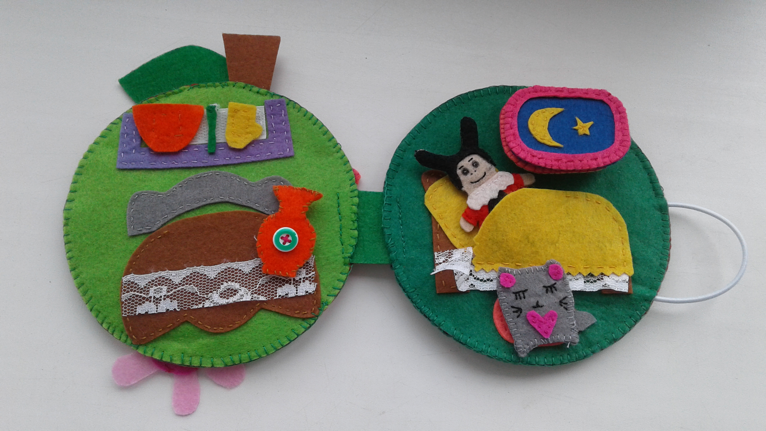 Вначале планировалось несколько игрушек на липучках, несколько с петельками, чтоб вешал сам на пуговички, но вешать оказалось трудно еще ему, и чтоб не психовал, пришлось приклеить на все игрушки липучки... С фетром кстати работала впервые, вспомнила что такое шитье конечно не все идеально, но ведь это же не на конкурс)