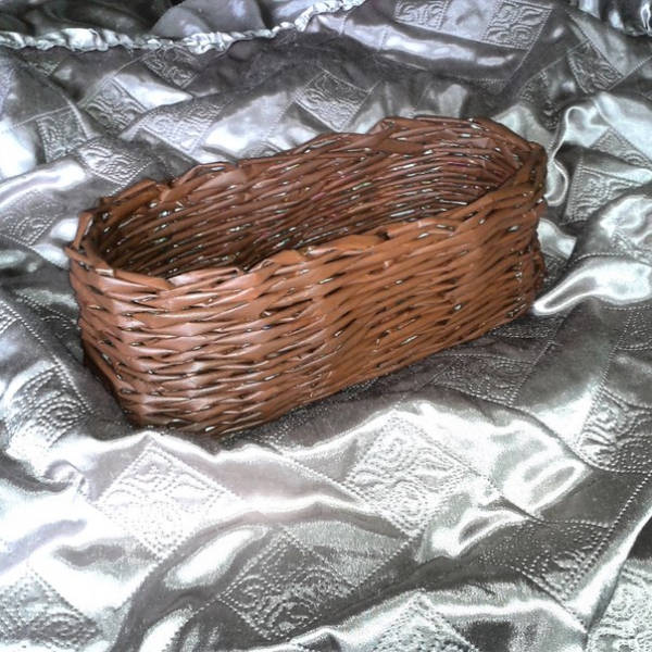 Газеты нарезаються полками во всю длину газеты,шириной примерно 10 см.Сворачиваем из них трубочки. На дно я брала картон,мделала отвертия в нем примерно через 3-5 см ,вставила трубочки ,затем их оплетала. Готовую корзинку покрасила акриловой краской,предварительо смешав ее с клеем ПВА 1 к 1